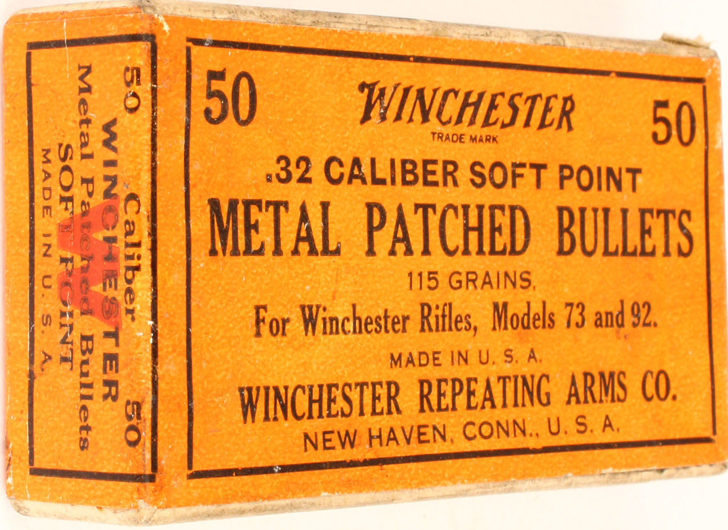 Winchester, .32 Cal., 115 Grs. Metal Patched Soft Point Bullets, FULL & Half SEALED, 2pc. Buff box with orange label, box has light soiling & small scuffing, with great colors. Grade: Excellent - Value: 20 to 60