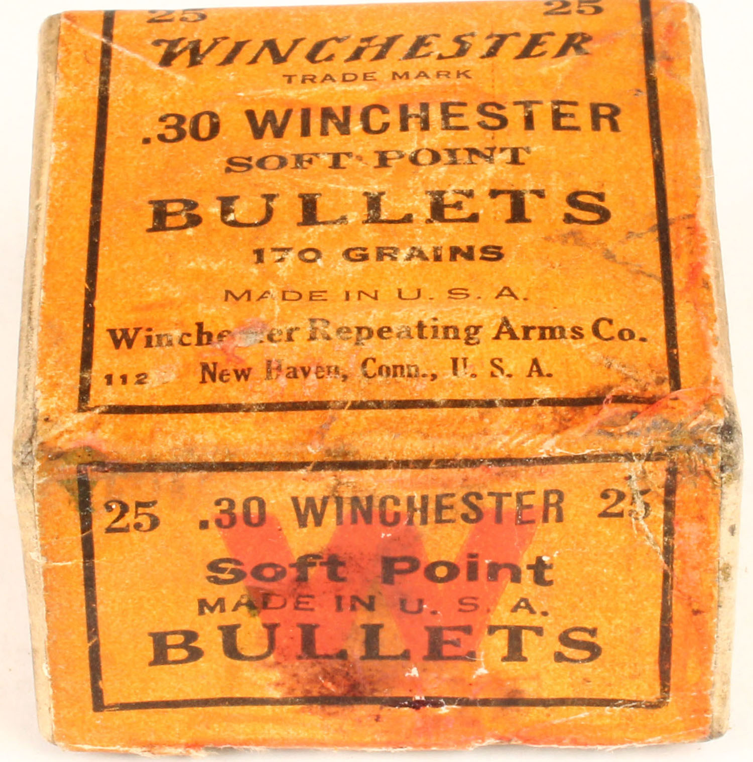 Winchester, .30 Cal., 170 Grs. Metal Patched Soft Point Bullets, Partial 17rds., 2pc. Buff box with orange label, box has soiling & scuffing, with very nice colors, Bullets are very good. Grade: Very Good ++ - Value: 20 to 60