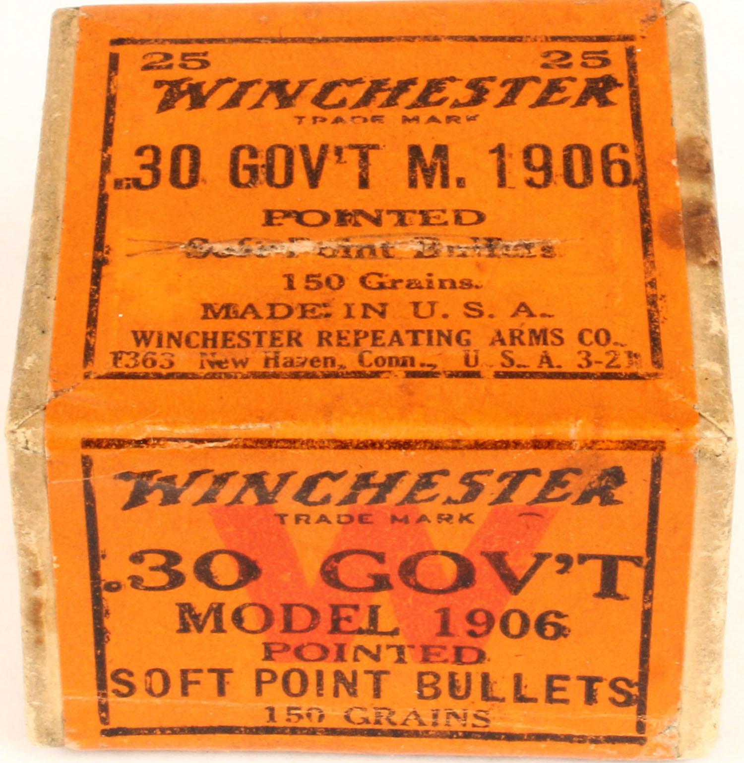 Winchester, .30 Gov't, 150 Grs. Pointed Soft Point Bullets, Full, 2pc. Buff box with orange label, box has light soiling with small scuffing, with great colors, Bullets are excellent. Grade: Excellent - Value: 20 to 60
