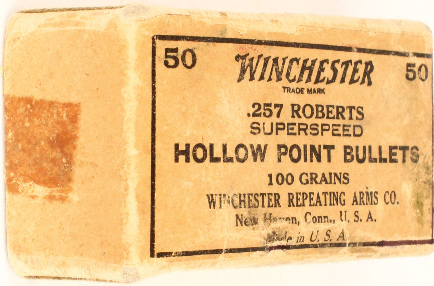 Winchester, 257 Roberts Superspeed, 100 Grs., Hollow Point Bullets, Full, 2pc. Buff box with buff label, box is very solid, has light soiling with very nice colors, Bullets are excellent. Grade: Excellent - Value: 20 to 60