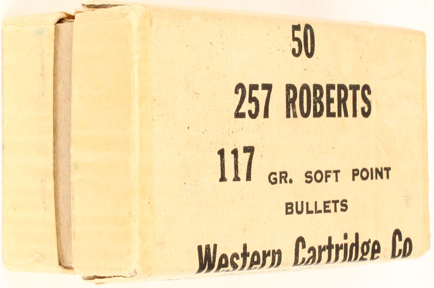 Western, 257 Roberts, 117 Grs., Soft Point Bullets, Full, 2pc. Buff box with buff label, box seam splits & light soiling with very nice colors, Bullets are excellent. Grade: Excellent - Value: 20 to 60