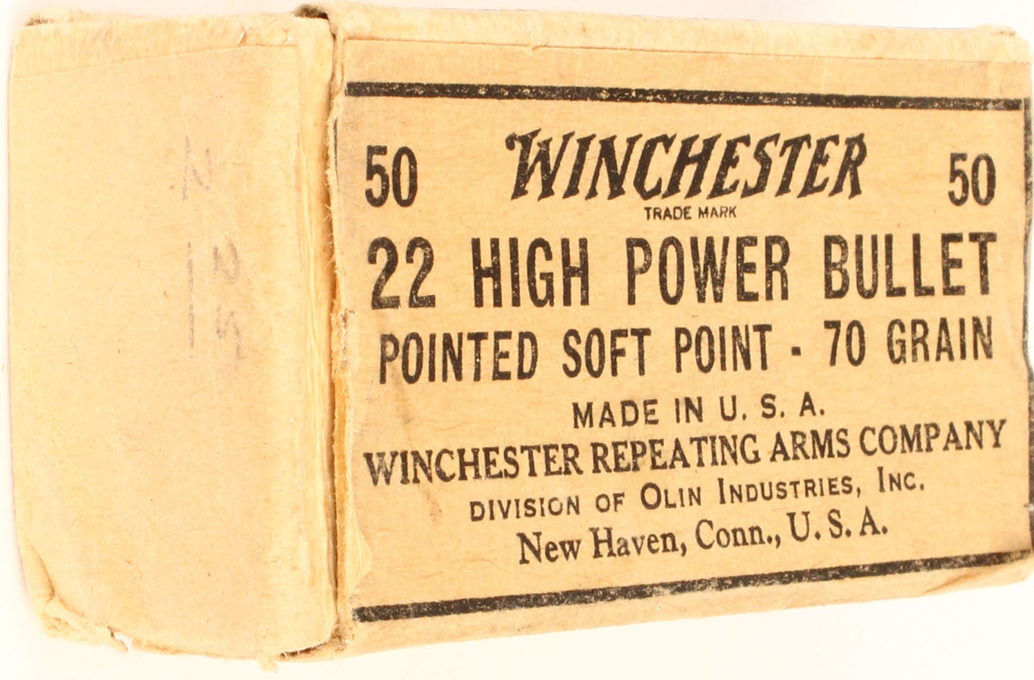 Winchester, 22 High Power, 70 Grs., Pointed Soft Point Bullets, Full, 1pc. Buff box with buff label, box has inside flap torn with very nice colors, Bullets are excellent. Grade: Excellent - Value: 20 to 60
