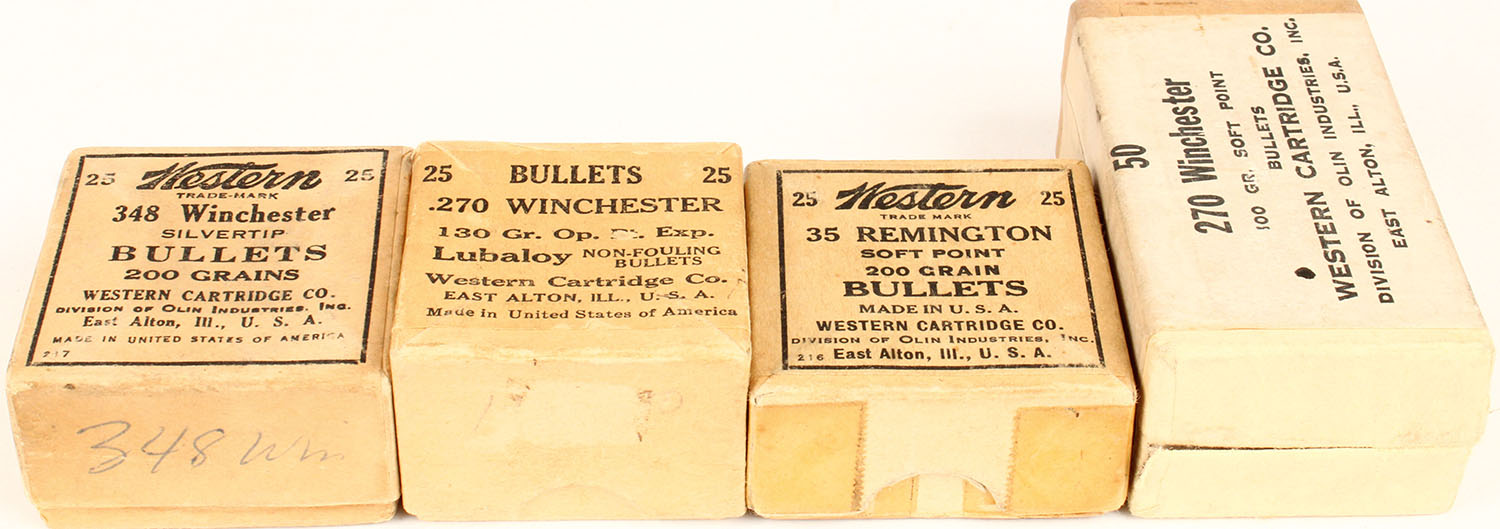 Lot of 4 Winchester Bullet boxes, 270 Win, .35 Rem, .348 Win, .270 Win, 2pc., Full. Grade: Excellent - Value: 20 to 60