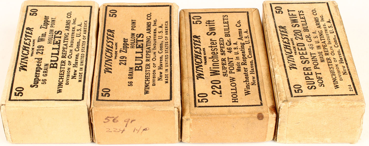 Lot of 4 Winchester Bullet boxes, (2) .219 Zipper & (2) 220 Swift, 2pc., Full. Grade: Excellent - Value: 20 to 60
