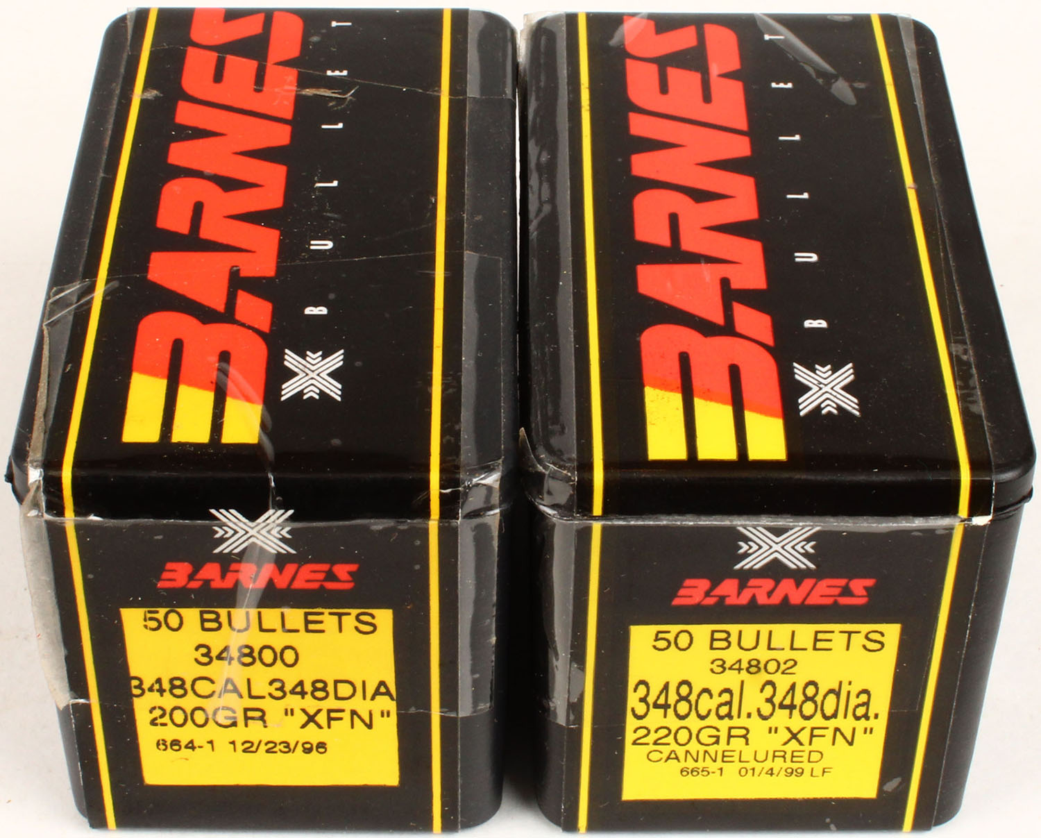 Barnes, .348 Ca;. (.348'') 220 Gr. XFN Cannelured, lot of (2) FULL & SEALED 1pc. Black plastic boxes, boxes are MINT with minty color. Grade: MINT - Value: 20 to 100