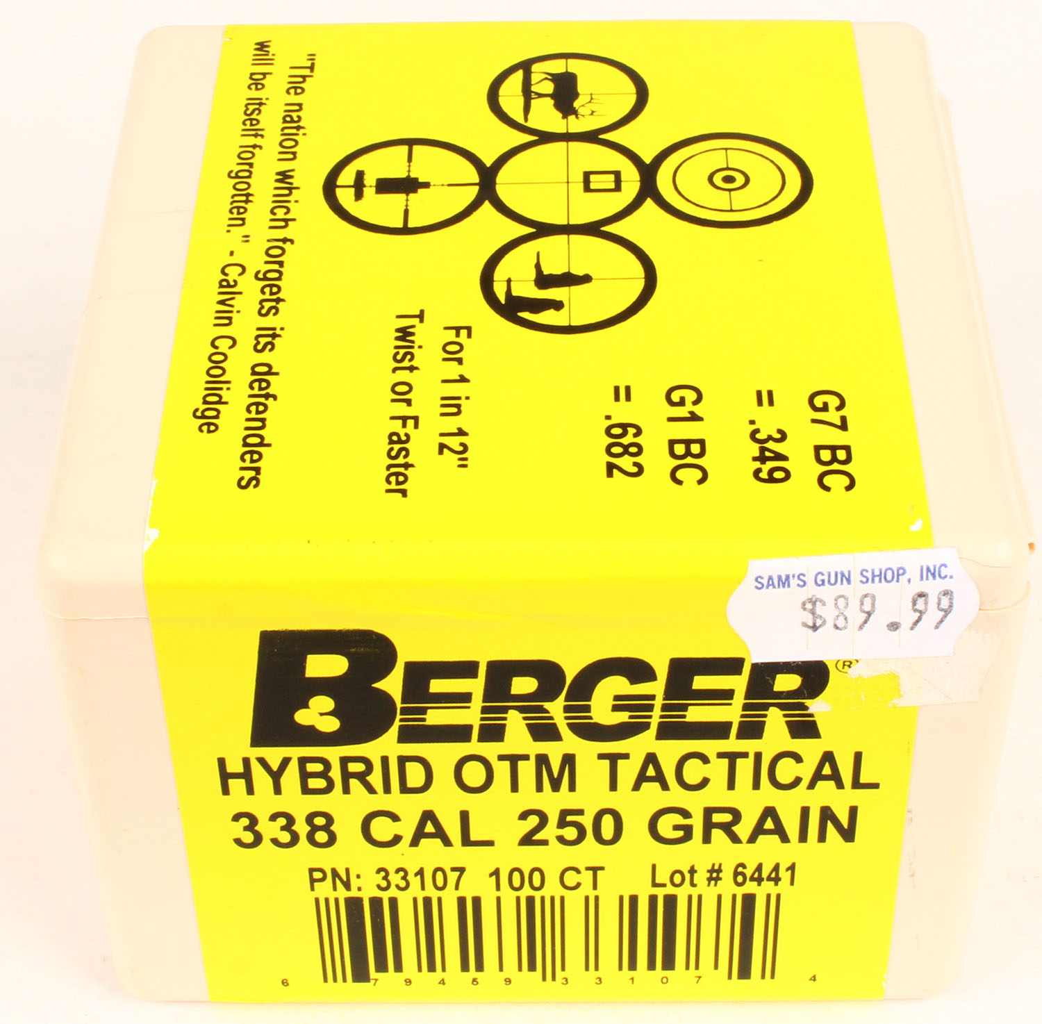 Berger, Hybrid OTM Tactical, .338 Cal. 300 GR., FULL & SEALED 1pc. Tan plastic box, box is MINT with minty color. Grade: MINT - Value: 20 to 100