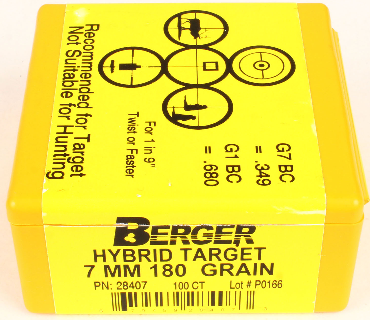 Berger, Hybrid Target, 7mm, 180 GR., Full, 1pc. Yellow plastic box, box is MINT with minty color, bullets are mint. Grade: MINT - Value: 10 to 50
