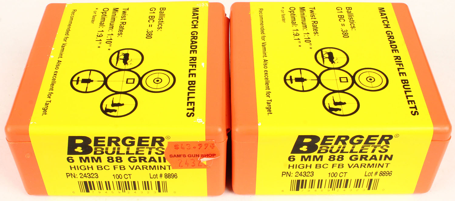 Berger, Match Grade Rifle Bullets, 6mm, 88 GR. High BC FB Varmint, lot of (2) FULL & SEALED, 1pc. Orange plastic boxes, boxes are MINT with minty color. Grade: MINT - Value: 20 to 100