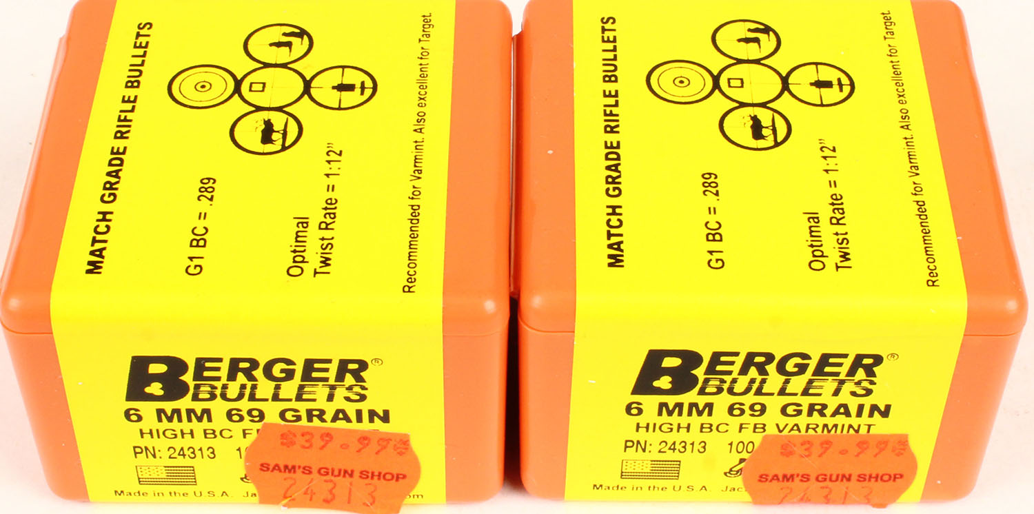 Berger, Match Grade Rifle Bullets, 6mm, 69 GR. High BC FB Varmint, lot of (2) FULL & SEALED orange boxes, boxes are MINT with minty color. Grade: MINT - Value: 20 to 100