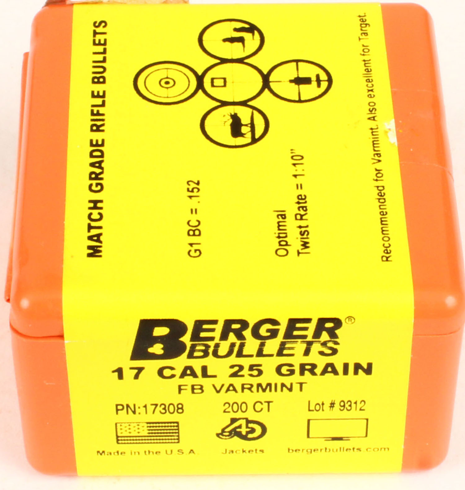 Berger, Match Grade Rifle Bullets .17 Cal, 25 GR. FB Varmint, FULL & SEALED, 1pc. Orange plastic box, box is MINT with minty color. Grade: MINT - Value: 10 to 50