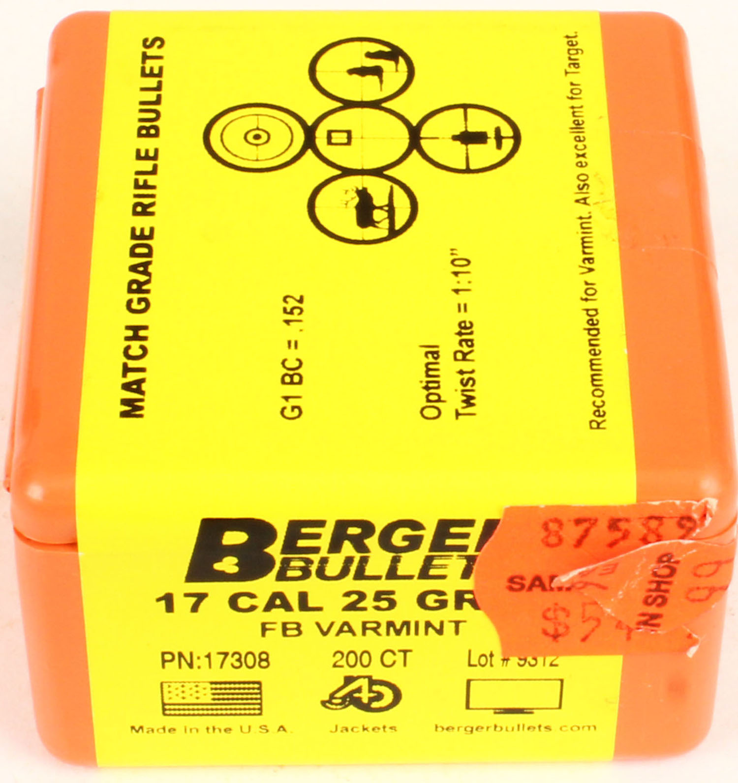 Berger, Match Grade Rifle Bullets .17 Cal, 25 GR. FB Varmint, FULL & SEALED, 1pc. Orange plastic box, box is MINT with minty color. Grade: MINT - Value: 10 to 50