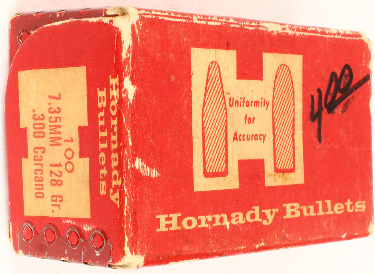 Hornady, 7.35mm/.300 Carcano, 128 GR., Full, 1pc. Red & white box, box is solid with very good color, age soiling, some edge & corner wear, top has been written on, bullets are minty. Grade: Excellent - Value: 10 to 50