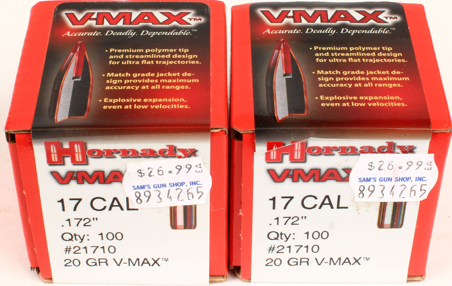 Hornady V-Max, .17 Cal. (.172''), 20 Gr. V-Max, lot of (2) boxes, both boxes are FULL & SEALED, boxes are mint with minty color. Grade: MINT - Value: 20 to 80