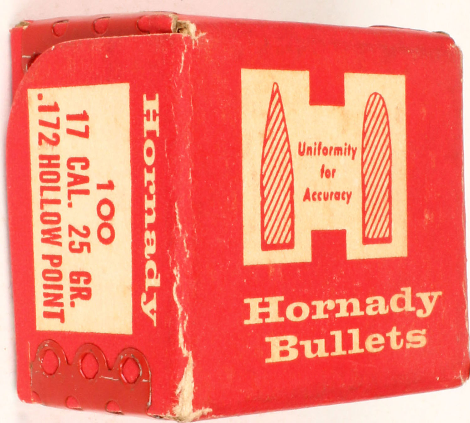 Hornady, .17 Cal. (.172''), 25 GR. Hollow Point, Full, 1pc. Red & white box, box is solid with excellent color, minor age soiling, minor edge & corner wear, bullets are minty. Grade: Excellent - Value: 10 to 50