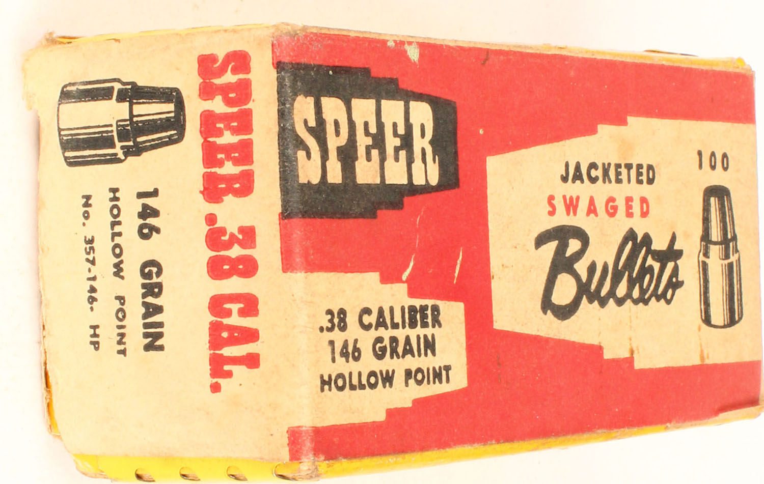 Speer, Jacketed Swaged Bullets, .38 Cal., 146 Grain Hollow Point, Full, 1pc. Multi-colored box, box is solid with very good to excellent color, age soiling, minor edge & corner wear, tape on front side, bullets are minty. Grade: Excellent - Value: 10 to 50