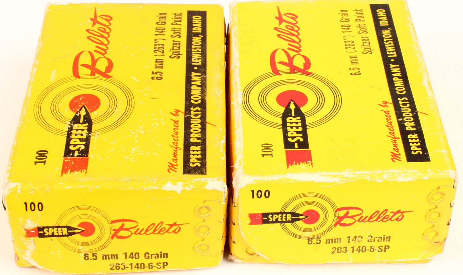Speer, 6.5mm (.263'') 140 GR. Spitzer Soft Point, lot of (2), both boxes full with some wear, bullets are minty. Grade: Excellent + - Value: 20 to 100