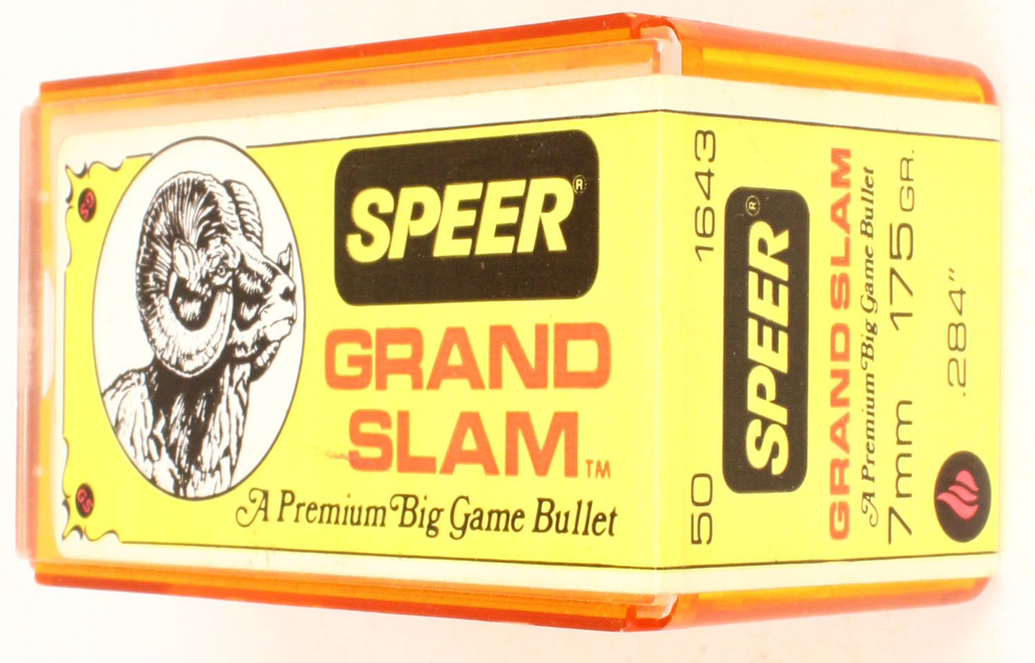 Speer, Grand Slam, 7mm (.284''), 175 GR. FULL & SEALED, 2pc. Amber plastic tray with yellow sealing label, box is solid, label is mint with minty color, bullets appear mint. Grade: Excellent ++ - Value: 10 to 50
