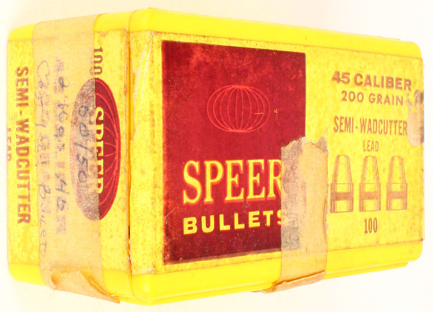 Speer, .45 Caliber, 200 GR. Semi- Wadcutter, Partial 61rds., 1pc. Yellow plastic box, box is solid with very good color, age soiling, bullets are excellent. Grade: Excellent - Value: 6 to 30