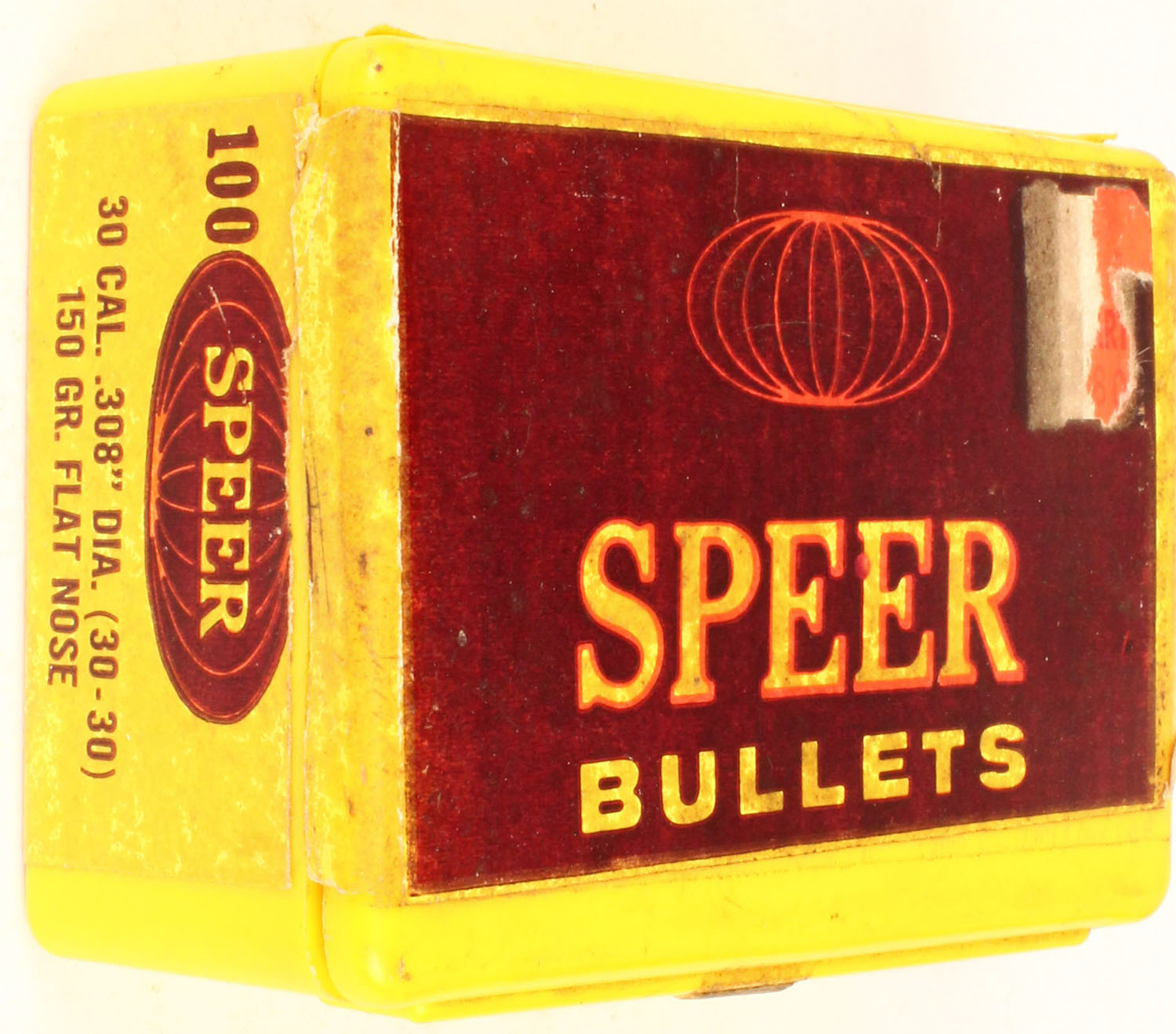 Speer, .30 Cal., ..308'' Dia. (.30-30), 150 Gr. Flat Nose, Full, 1pc. Yellow plastic box, box is solid with very good color, age soiling, shelf wear, bullets are minty. Grade: Excellent - Value: 10 to 50