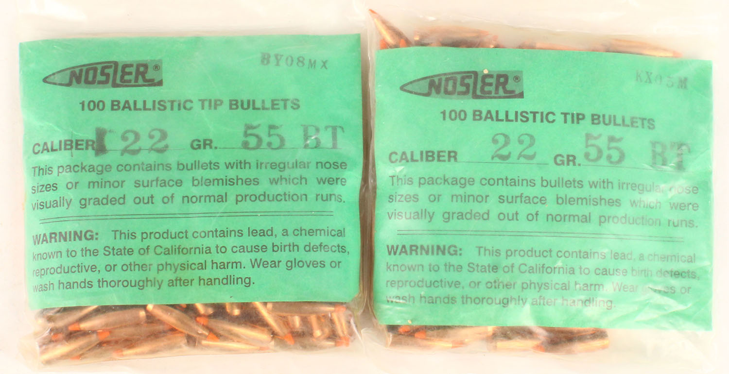 | Nosler, .22 Cal., 55 Gr. Boat Tail, lot of (2) 100rds. Bags, bag...