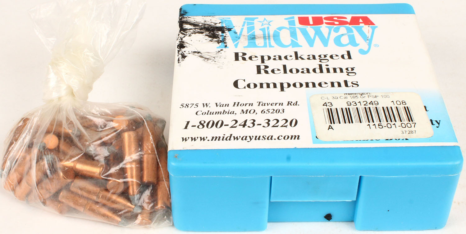 Midway, .30 Cal., 165 Gr. PSP, FULL & SEALED, 1pc. Blue plastic box, box is solid, some staining on top, lot also comes with some loose rounds of unknown caliber/grs. Grade: Excellent ++ - Value: 10 to 50