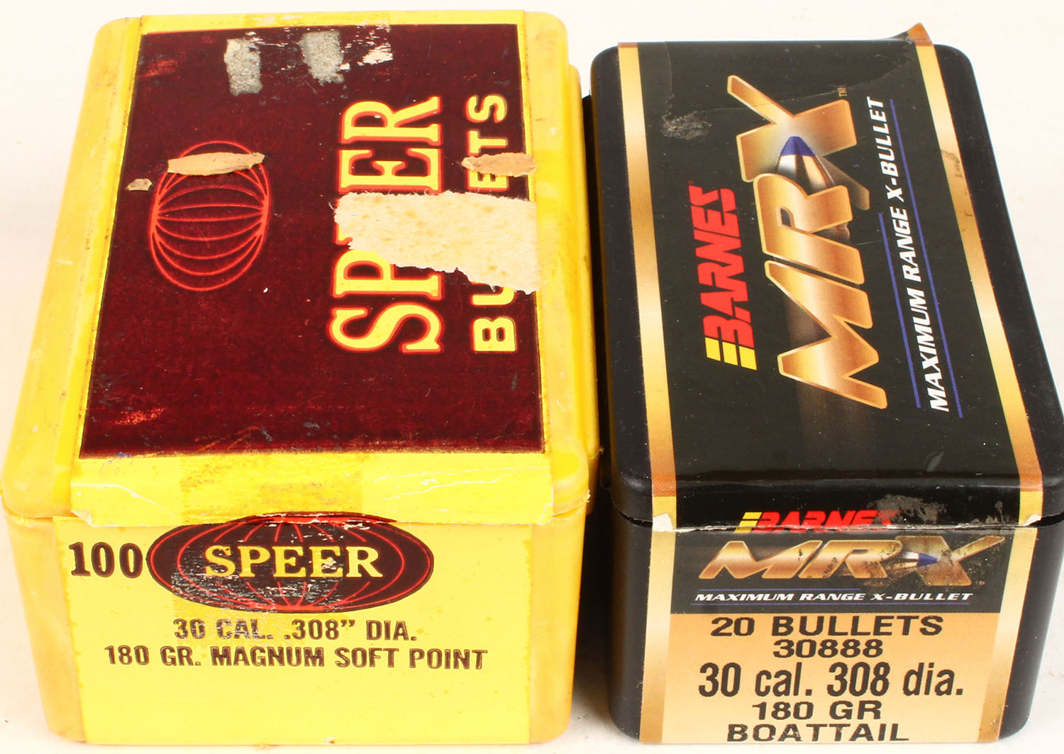 Mixed Mfg., lot of (2) boxes of 180 Grain .308 bullets, Speer box is full, Barnes box has 20 rounds, both boxes are worn, bullets inside are minty. Grade: Excellent - Value: 10 to 50