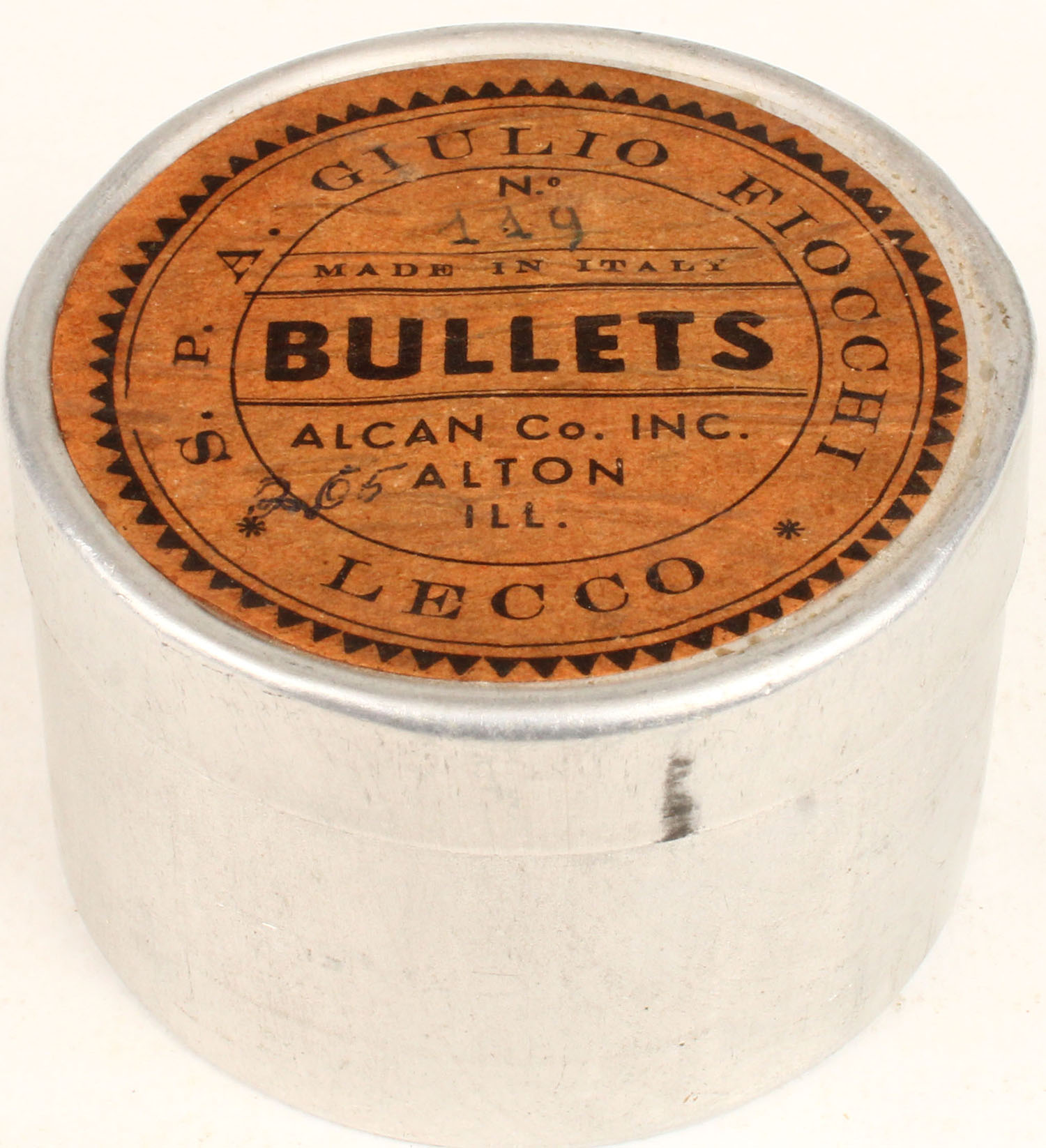 Alcan Co., tin of .450 cal. Bullets, grain unknown, tin is solid with no rust, label is excellent, label has been written on, bullets are excellent. Grade: Excellent + - Value: 6 to 30