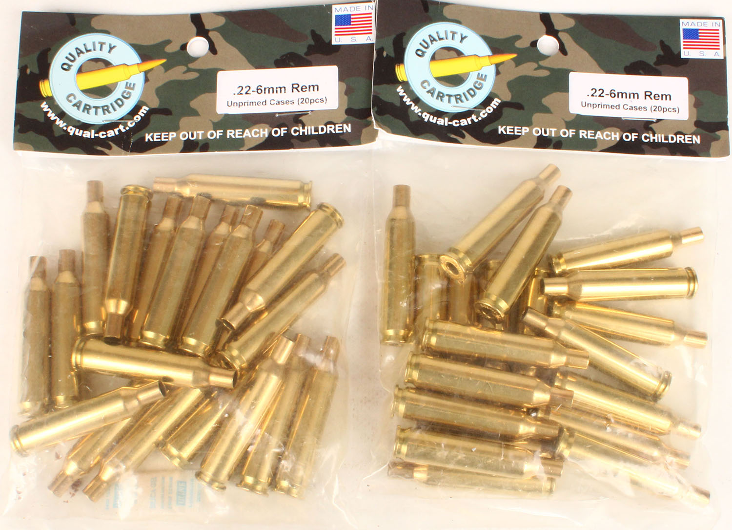 Quality Cartridge, lot of (2) .22-6mm Rem. Unprimed cases, bags are sealed, cases are mint. Grade: MINT - Value: 10 to 50
