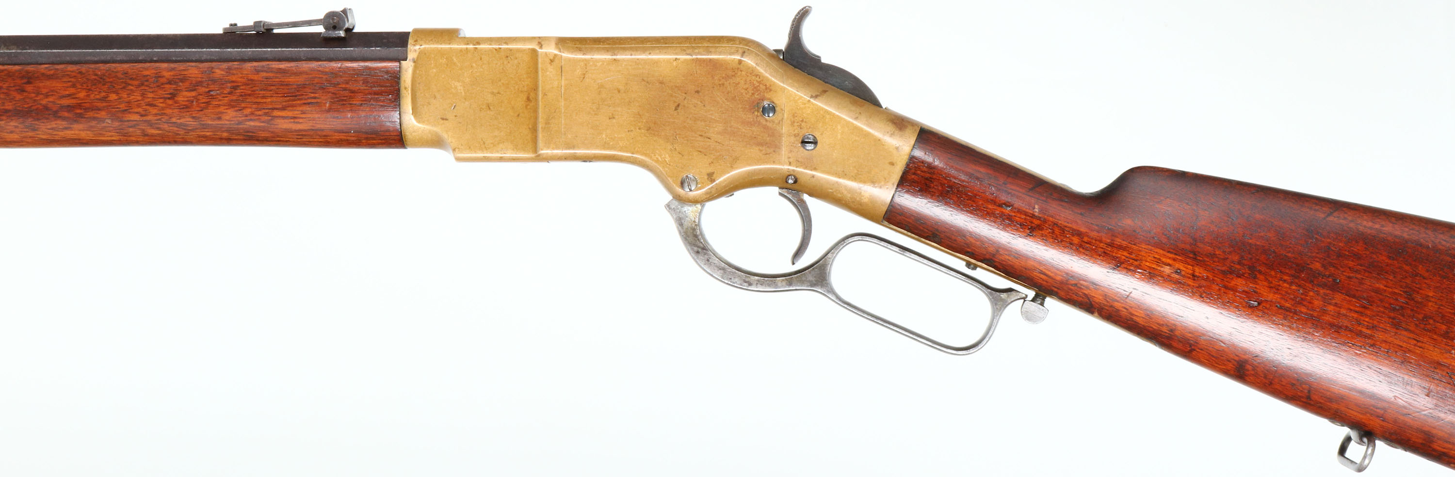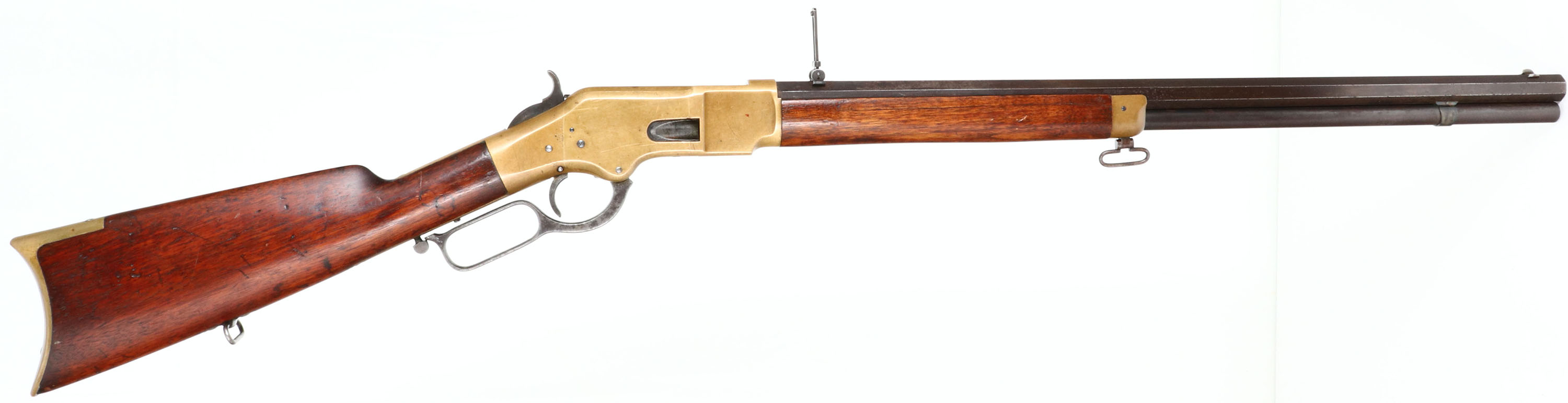 Winchester, Model 1866, Third Variation, .44 Henry Cal., MFG. 1870 (Antique), SN: 37234, Lever Action Rifle, 24 1/4'' Octagon barrel, Full mag. The Model 1866 proved an immediate success for Winchester, with around 170,000 guns produced. The M1866 appeared in three forms, carbine, rifle, & musket. The carbine made up 127,000 of the guns produced, making it by far the most popular, another 15,000 were musket, leaving just 28,000 rifles. A fairly small amount of rifles when comparing it to other Winchester models. The original wood stocks on this example are very good & solid, having added oils over the original finish giving it a rich & darkened oil appearance. The forend has nearly a full length tight grain crack on the right side, while both stocks display numerous small nicks, gouges & contusions, especially on the stock. The metal finish on the barrel & mag has fully toned to a full coverage dark chocolate brown patina. The brass receiver, forend cap & buttplate have developed an even aged mustard tone. Bore is good to very good, with some cleaned pitting & roughness amongst solid rifling. Barrel mounted with the correct flip-up ladder rear sight, slide graduation to 900 yds & a small blade front sight. Consistent with the 3rd model, it has the block font SN stamped behind the trigger on lower tang. Rifle has the hinged trapdoor crescent brass buttplate. Fitted with an early factory sling loop in the fore cap & stock. The action is tight when it's cycled. This is a very nice 1866 rifle. Retaining much of its original character. A great antique brass rifle. Antique, No FFL Req. - Value: 6000 to 12000