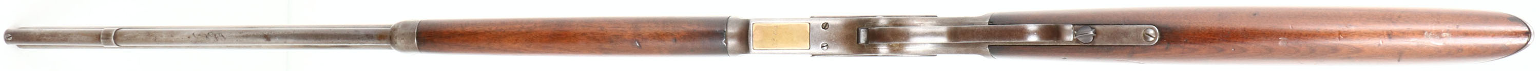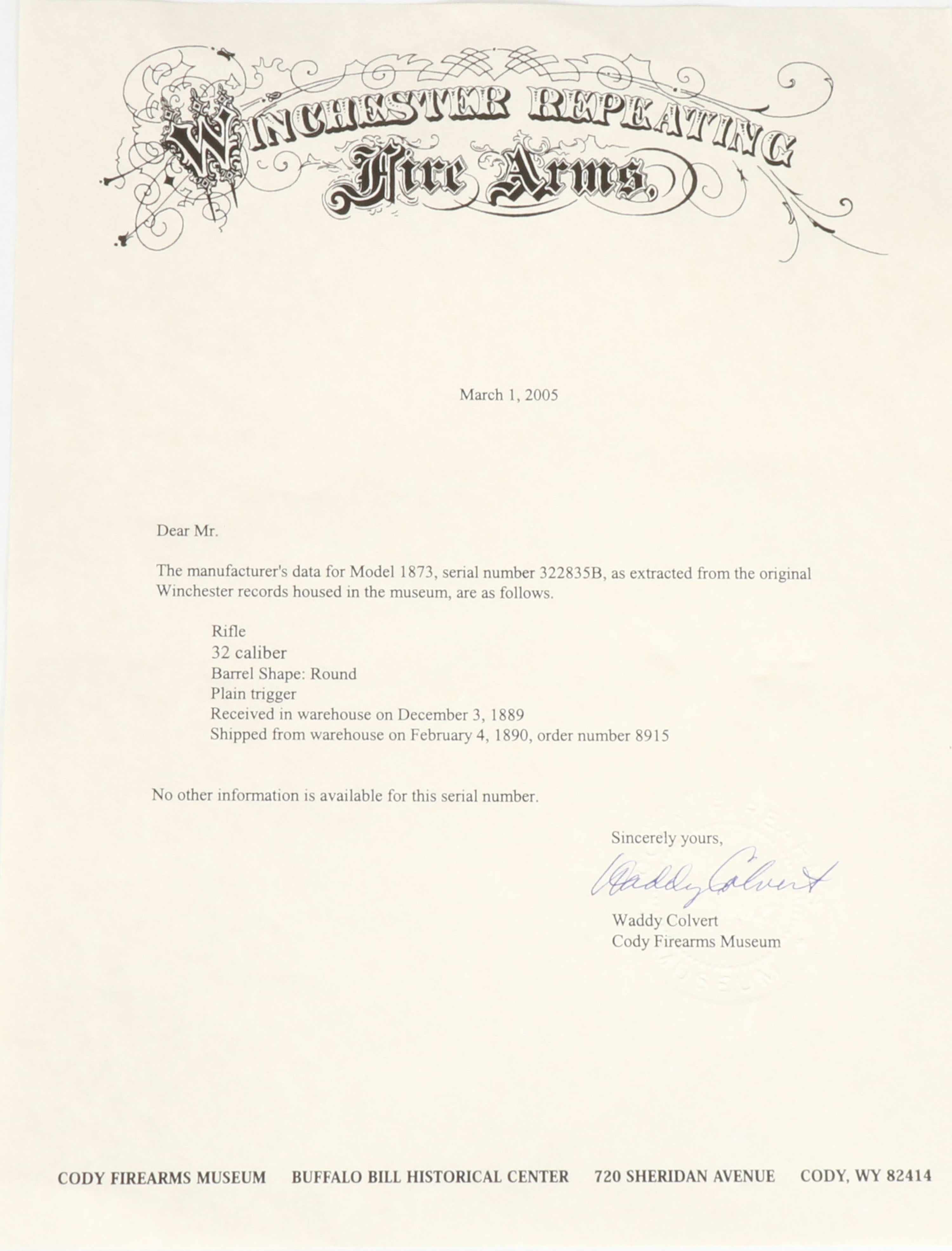 Winchester, Model 1873, 3rd Variation, Marked .32 W.C.F. Cal., MFG: 1889, SN: 322835B, Lever Action Rifle, 24'' Round barrel, Full mag. The original straight grip wood stock & forend are very good, having an added layer of finish over the original finish. There are several small contusions & minor scratches or scrapes. The metal blue finish has worn away to mostly gun metal gray, with a thin layer of brown patina. Bore is fair, appears dark, with pitting & roughness amongst thin rifling. The barrel holds an adjustable rear sight & pinched silver blade front sight. Stock carries a smooth crescent metal buttplate. Dust cover needs to be manually pulled to the rear for the lever to close & the rifle to fire. The rifle needs to visit a gunsmith for adjustment or repair before use. Comes with a Cody Winchester Factory Records Letter, which confirms dates & configuration. A solid & antique 1873, with a nice appearance. Antique, No FFL Req. - Value: 1500 to 3000