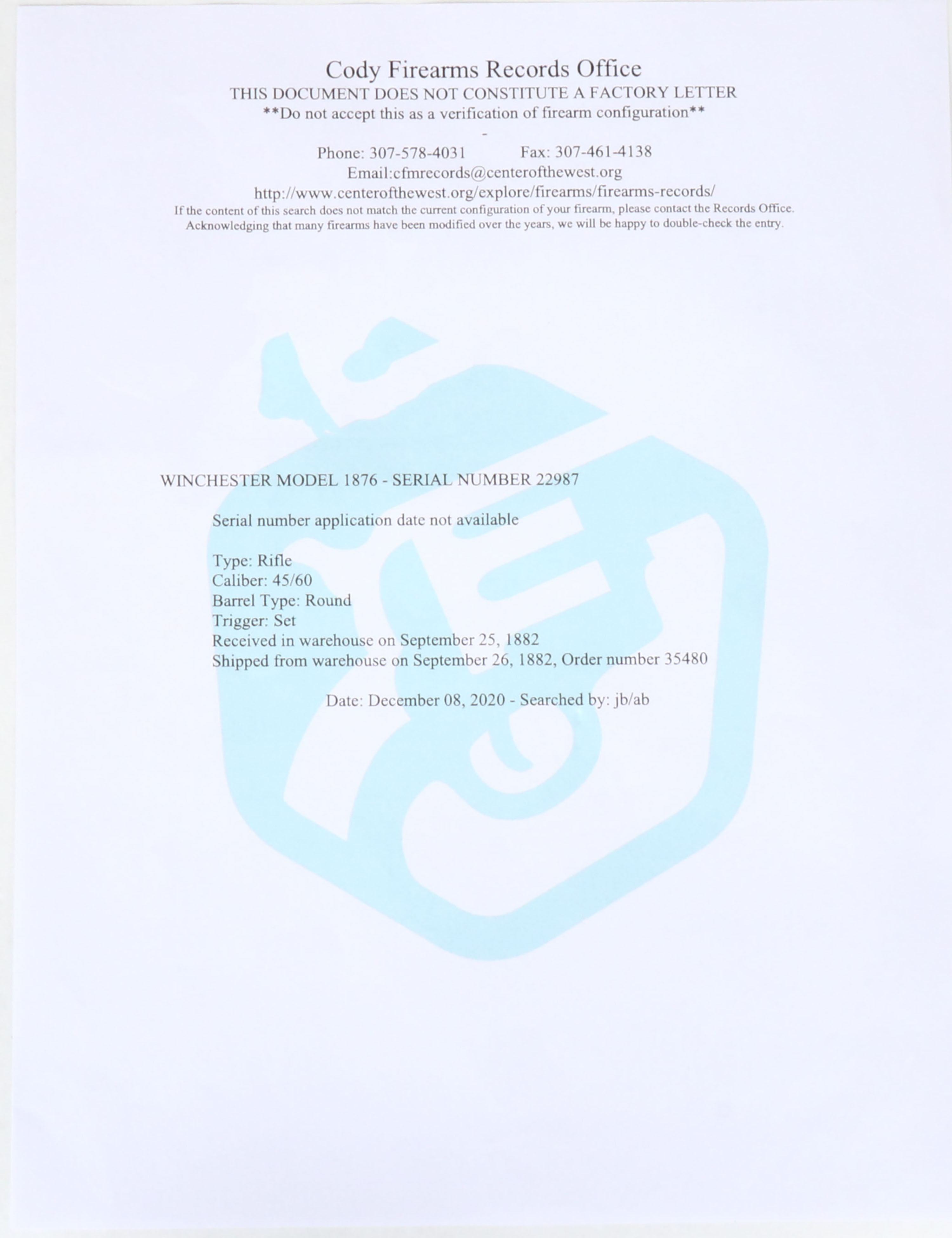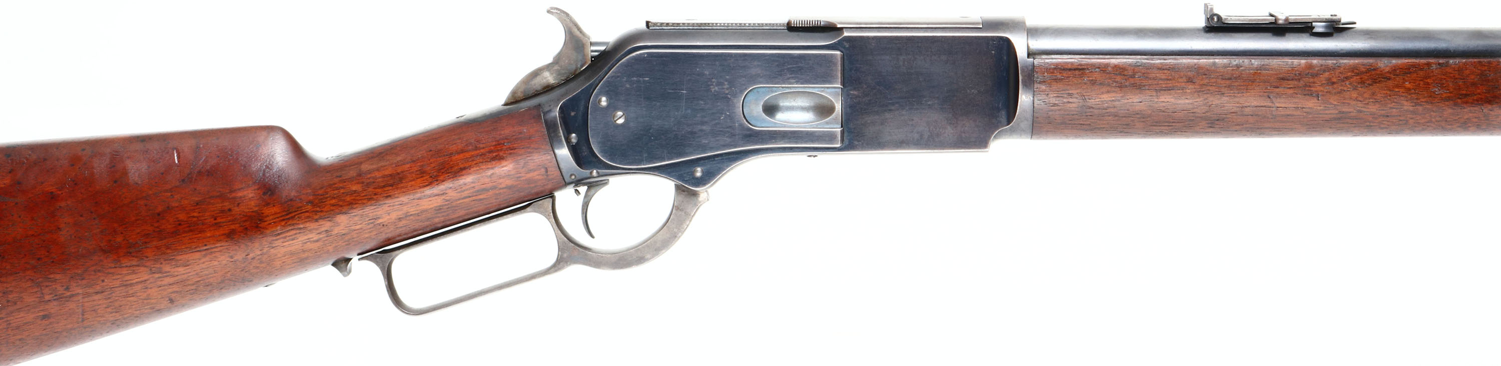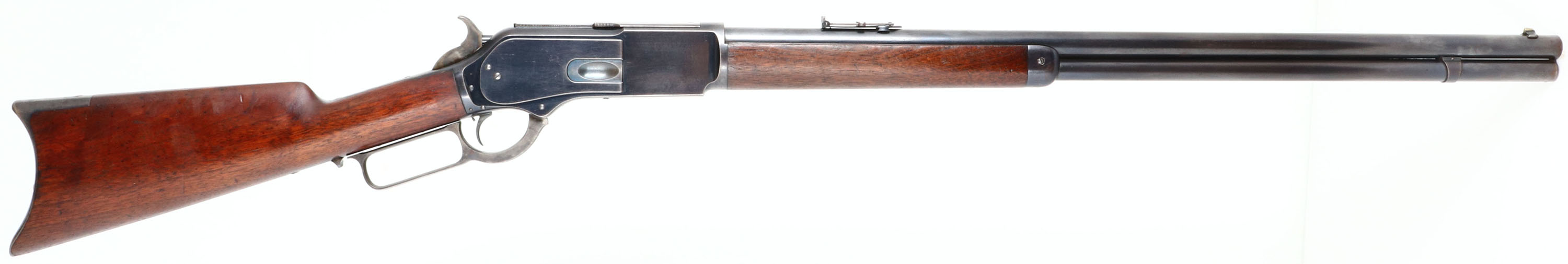 FABULOUS Winchester, Model 1876, Second Variation, 45-60 Cal., MFG: 1882, SN: 22987, Lever Action Rifle, 28'' Round barrel, Full mag. Transition rifle, with 2nd variation dust cover rail & 3rd variation dust cover. The original wood stocks are excellent & solid. Wood finish is original, with some added protective oils or waxes. There are very few tiny handling marks, light scratches & contusions. The factory metal blue on barrel & mag is 95%. The receiver displays a full 90% of the original high luster blue toning in areas of thinning. Original blue remains well above average. The case-hardened lever, hammer & trigger display fading case-colors. Bore is excellent & bright, with a couple of spots of roughness. Set Trigger. Barrel carries the original 1876 marked adjustable ladder rear sight & period front sight. Stock carries a sliding trapdoor crescent metal buttplate. Original dust cover is tight & slides smoothly. Action is tight & smooth. Comes with a Cody Winchester Factory Records look-up sheet, which confirms dates & configuration. A fantastic original example & collector's quality rifle.* Antique, No FFL Req. - Value: 12000 to 15000