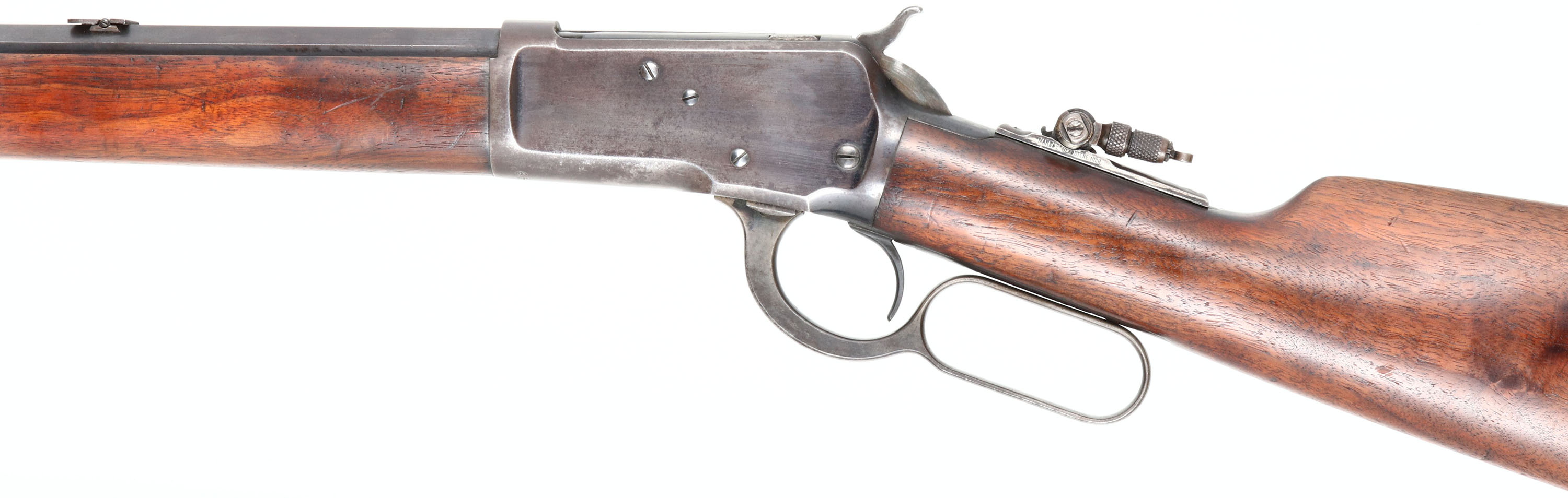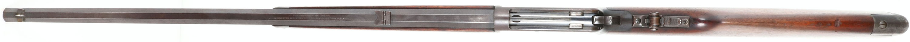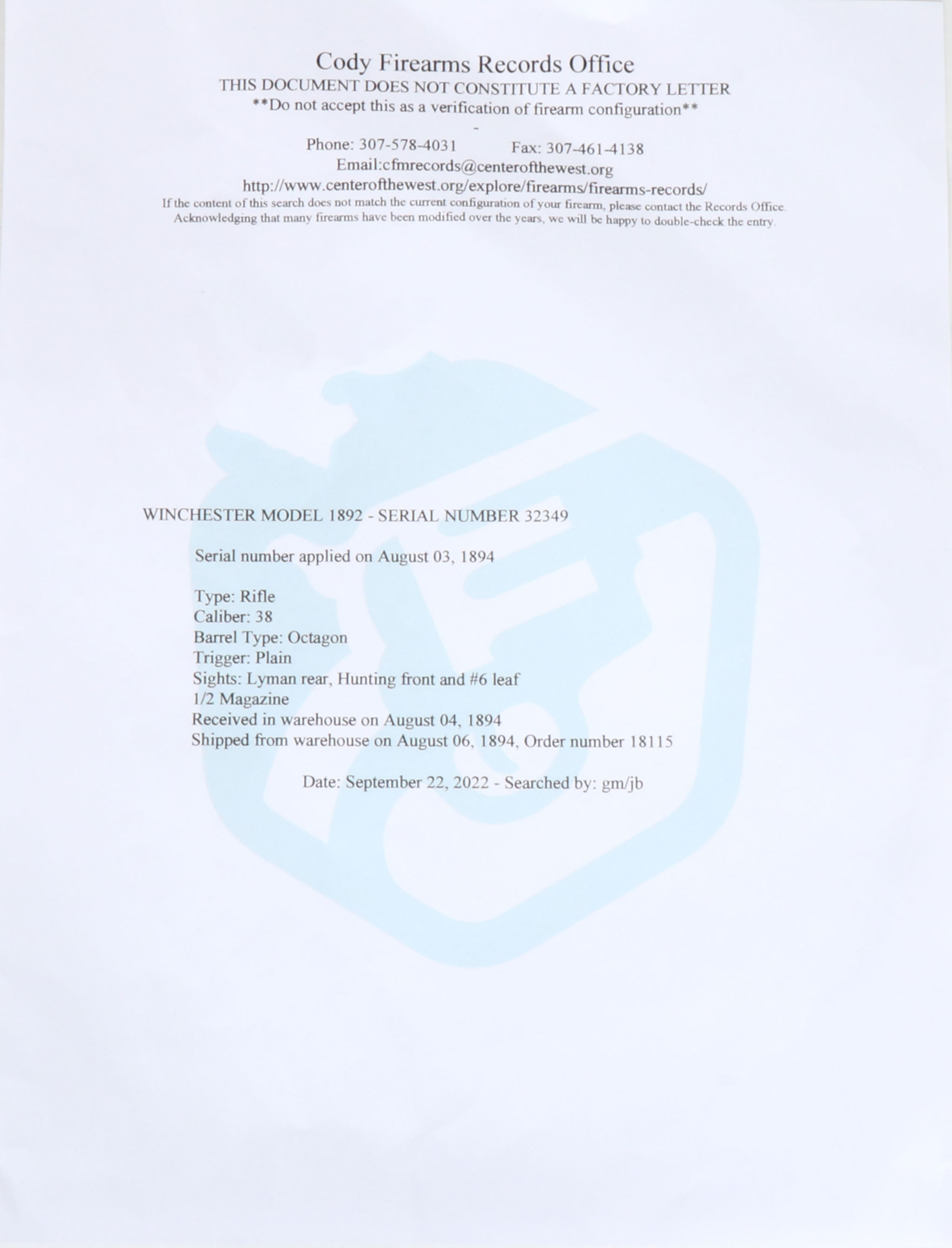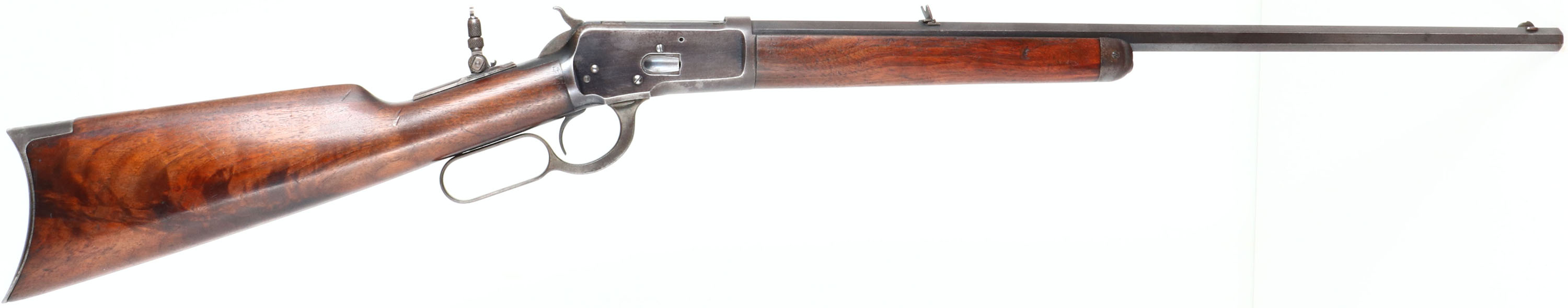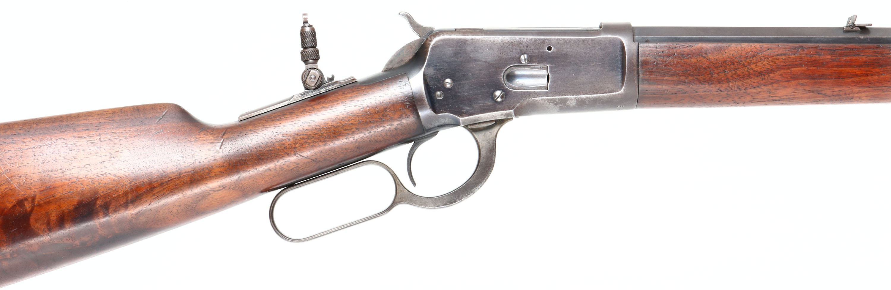 Winchester, Model 1892, CAL: 38 WCF, MFG: 1904, SN: 32349, Lever Action Rifle, 24 1/4'' Octagon barrel. Button mag. The original straight grip wood stocks are excellent, with wonderful & unusual grain, particularly on the stock. There are several minor contusions, scrapes & scratches to the original finish. The original metal finish has aged & toned to an even plum brown patina, with 80% coverage on the barrel & a full coverage of the same toned but thin finish on the receiver. Bore is excellent. The rifle is fitted with a Marble flip-up tang sight, while the barrel holds a Lyman folding two leaf rear sight & a Lyman half-moon ivory bead blade front sight. Buttstock carries a smooth crescent metal buttplate.Smooth tight action. Comes with a Cody Winchester Factory Records look-up sheet, which confirms dates & configuration. A very nice original example,nicely configured, with unique features & special order upgraded sight package. FFL or C&R Req. - Value: 3500 to 5000