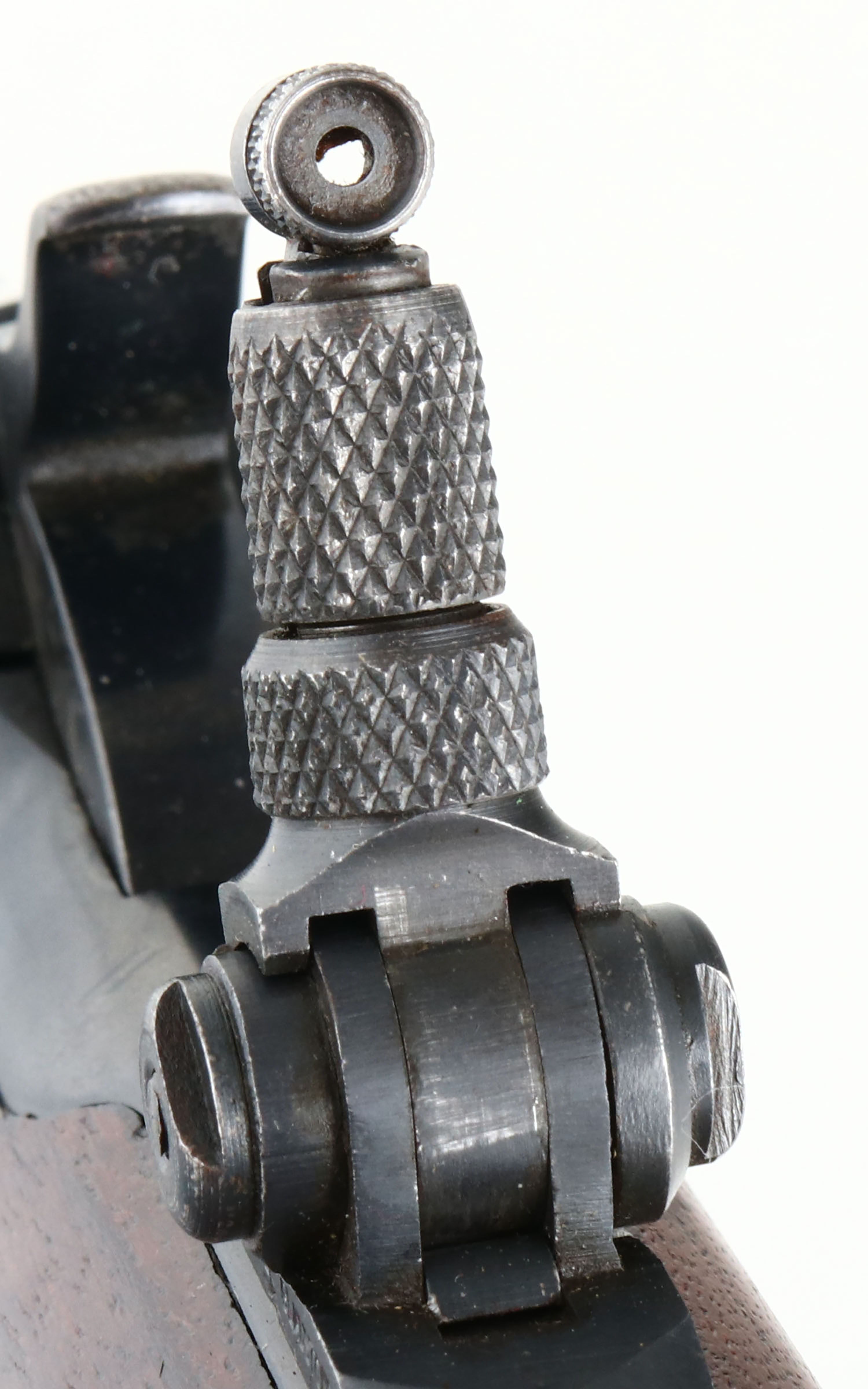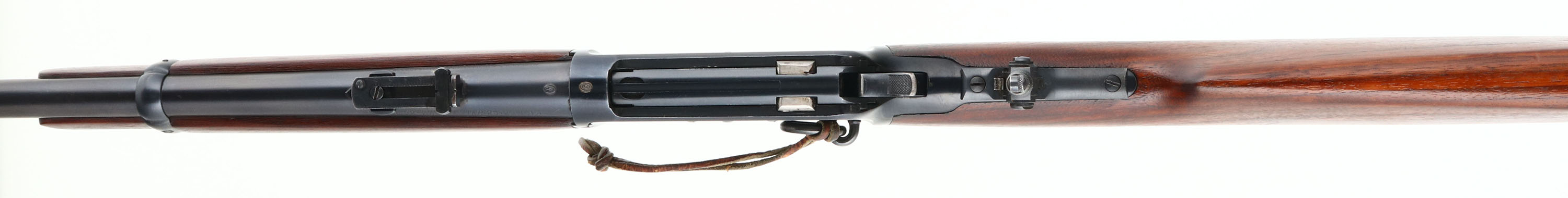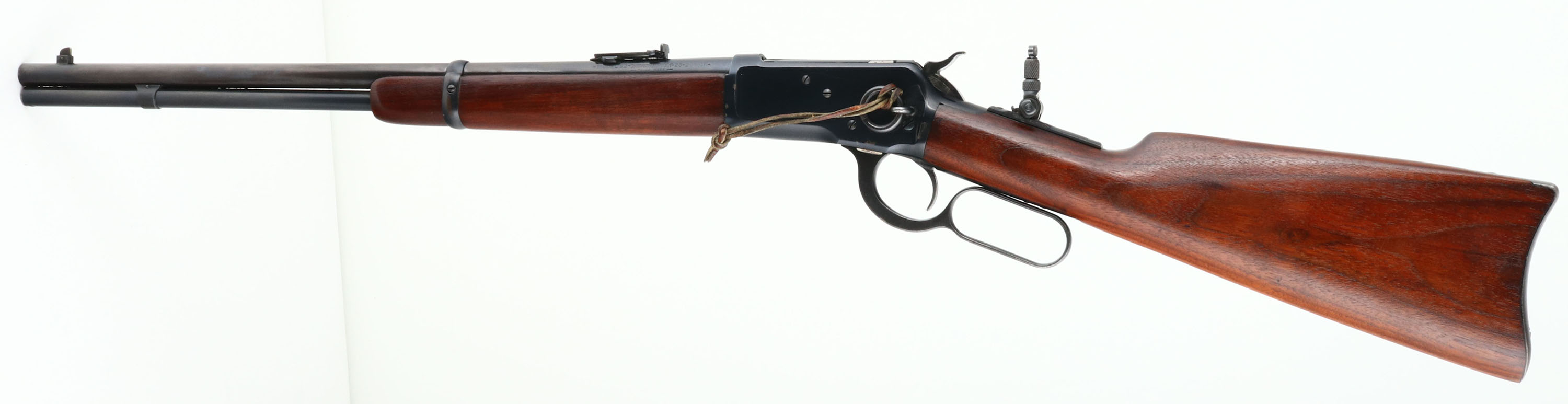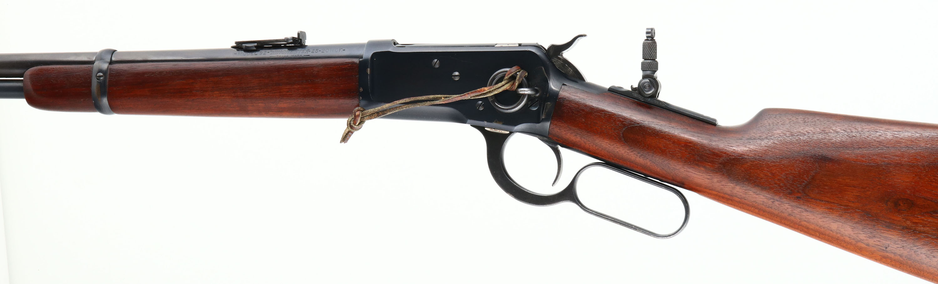 FANTASTIC Winchester, Model 92 SRC, marked 25-20 WCF, MFG. 1926, SN: 968147, Lever Action Rifle, 20'' Round Barrel, Full mag. The original wood stocks are excellent & solid. They carry the original finish, with few light handling blemishes or scuffs. The barrel & mag carry 98% of original factory blue, 97% on receiver. Bore is very good. Fitted with a Lyman flip-up adjustable tang sight, carbine ladder rear sight & carbine box front sight. Metal carbine buttplate. Original saddle ring, with leather strap. Tight action. A fabulous little carbine in original condition & very collectible.* FFL or C&R Req. - Value: 5000 to 7000