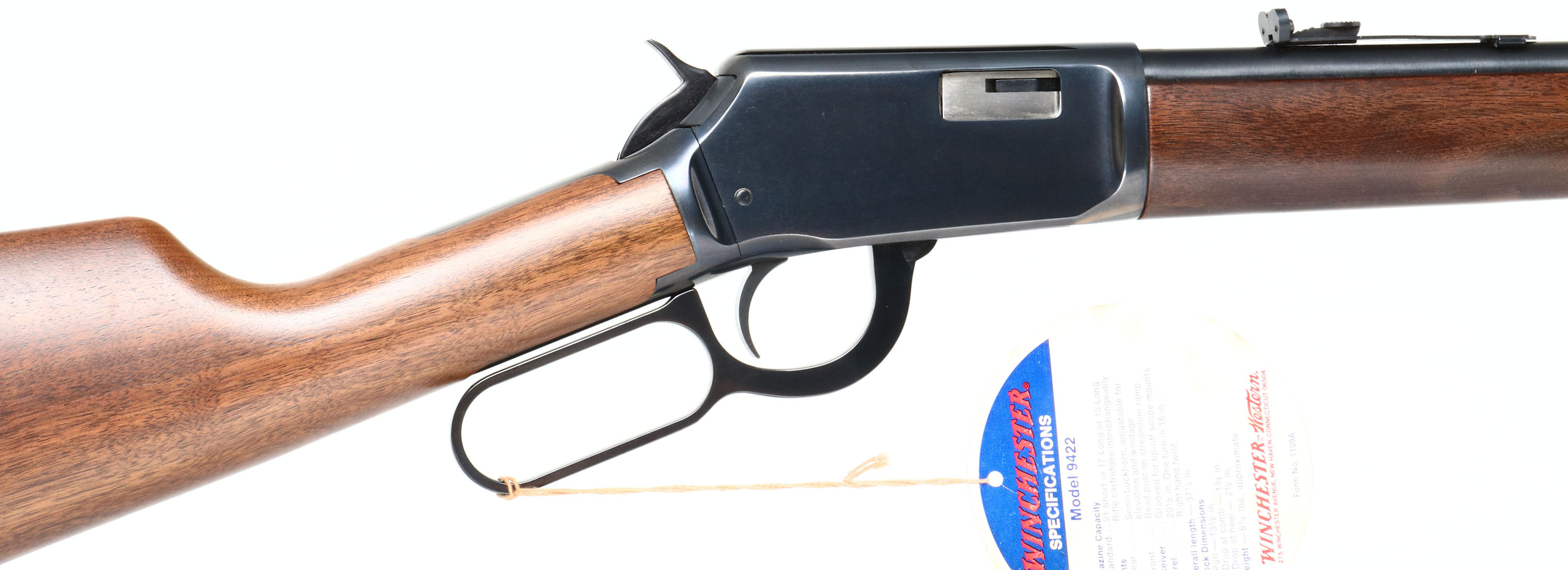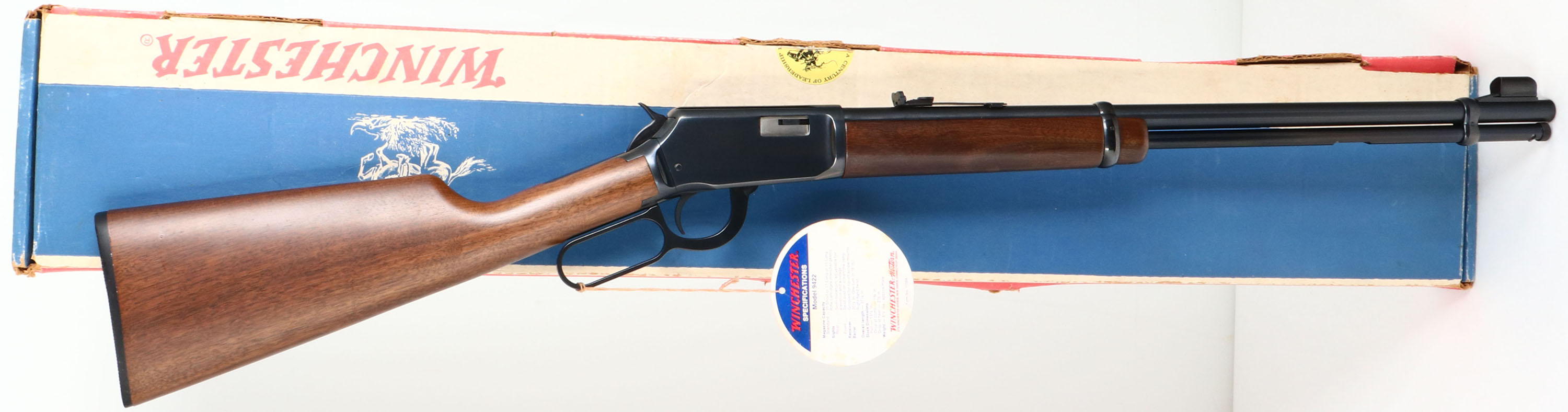 BOXED Winchester Model 9422, CAL: .22 S.L.LR, MFG: 1972, SN: F2813, Lever Action Rifle, 20'' barrel. Grooved receiver. The original checkered, straight grip wood stocks & factory finish are excellent, basically new. The metal blue finish rates 100% overall. Barrel holds an adjustable rear elevator sight & large hood front sight. Bore is mint. Buttstock carries a factory Winchester, checkered, black plastic buttplate. This is a 50+ year old NOS firearm, with hang tag still on the gun, in the the original box, with packaging & paperwork. FFL Req. - Value: 800 to 1400