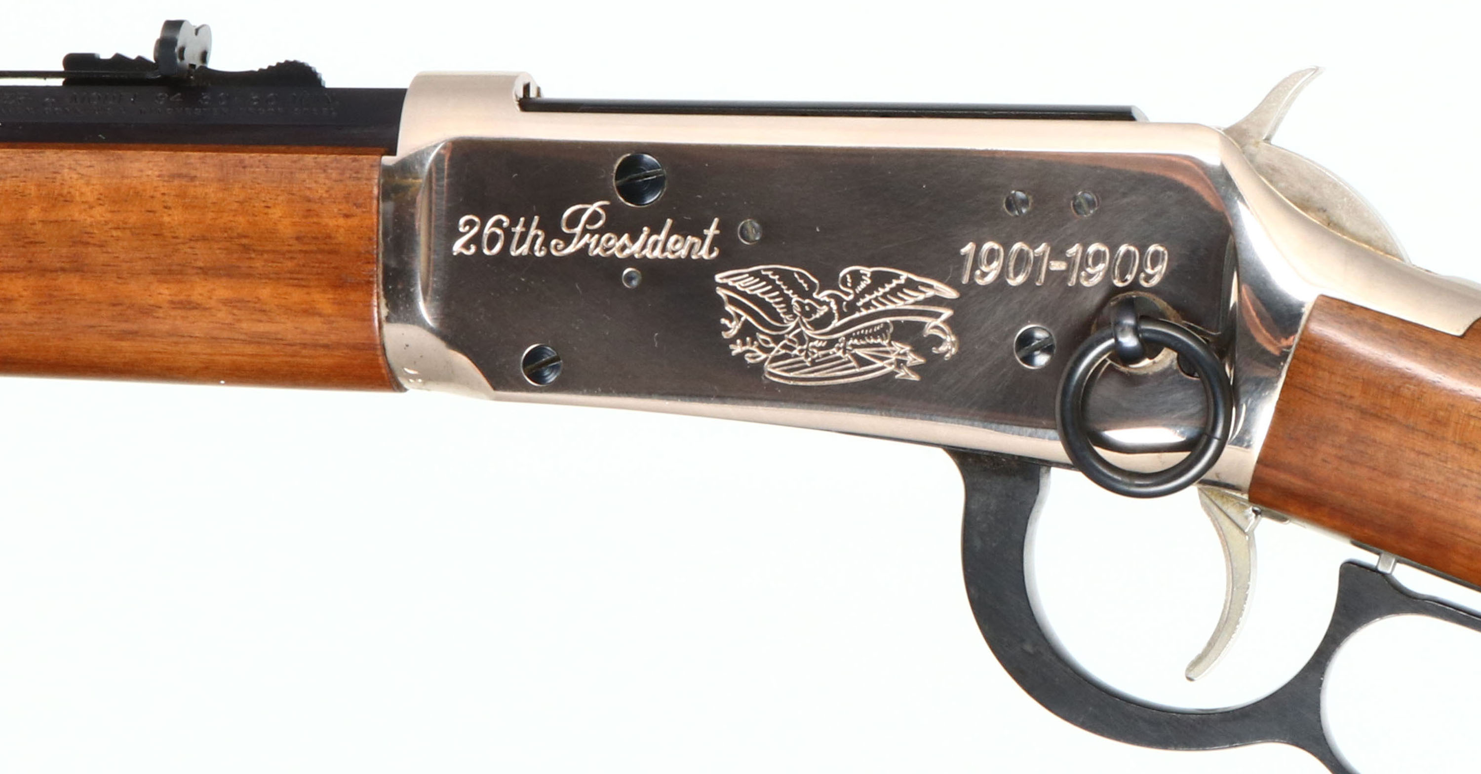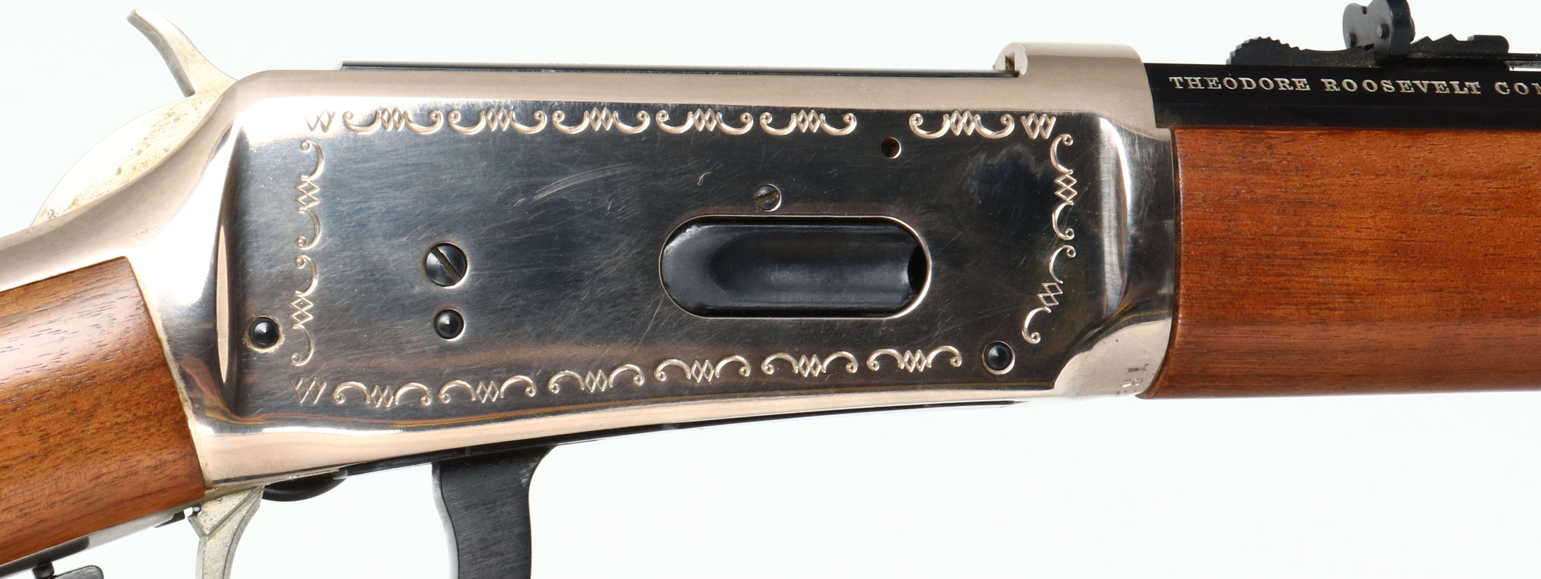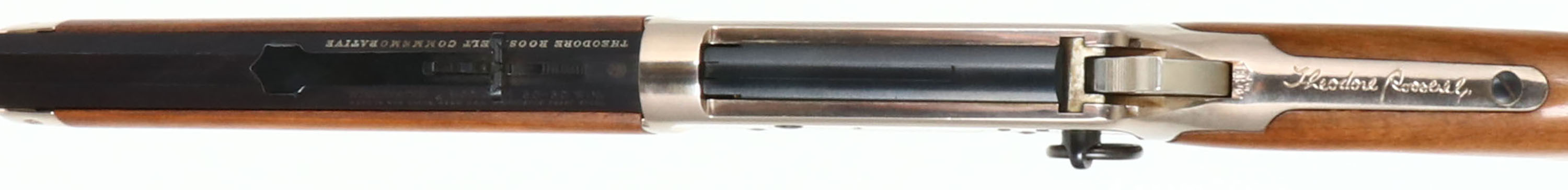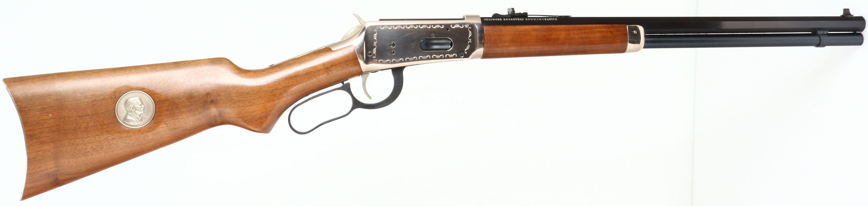 Winchester, Model 94 Theodore Roosevelt Saddle Ring Short Rifle, MFG:1969, SN: TR28537, Lever Action Rifle, 20'' barrel. The original flat pistol grip wood stocks are excellent, with 100% of the original finish & no handling marks. The right side of the stock has an integrated commemorative T.R. coin. The silver receiver displays engraved scrolls, the American eagle, & ''28th President'' ''1901-1909''. Nickeled hammer & trigger. The metal blue finish on the barrel, mag & lever rates 99%+. Bore is excellent. The barrel holds original sights. Stock carries a silver smooth metal buttplate. Saddle ring. These T.R. commemoratives were made in both rifle & carbine, with only 52,386 produced in total. FFL or C&R Req. - Value: 600 to 1200