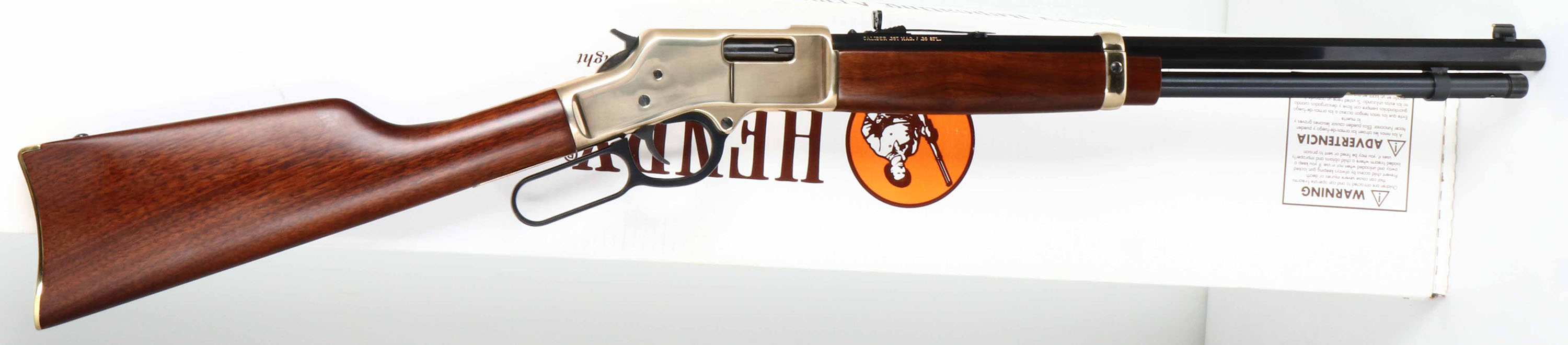 NEW BOXED, Henry Repeating Arms, Henry Big Boy, CAL: .357/38 SPL, MFG: Modern, SN: BB0009943M, Lever Action Carbine, 20'' Octagon barrel. Full Mag. The straight-grip stock & forearm are crafted of select American walnut accented with a brass barrel band & Henrys recognizable brass receiver. All have that crisp, smooth action that sets an authentic American-made Henry apart from other lever action rifles on the range & in the woods today.The original straight grip stocks are excellent. The metal blue finish rates 100% overall. The brass receiver & other parts are excellent. Bore is mint. Barrel carries factory sights. Buttstock carries a brass carbine style buttplate. Comes in original matching box, with paperwork. Basically NOS. A wonderful classic hunting rifle or heirloom. FFL Req. - Value: 1000 to 1500