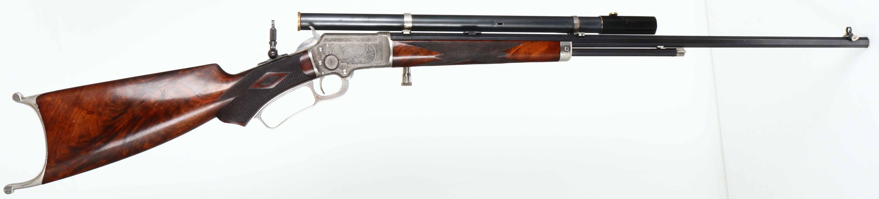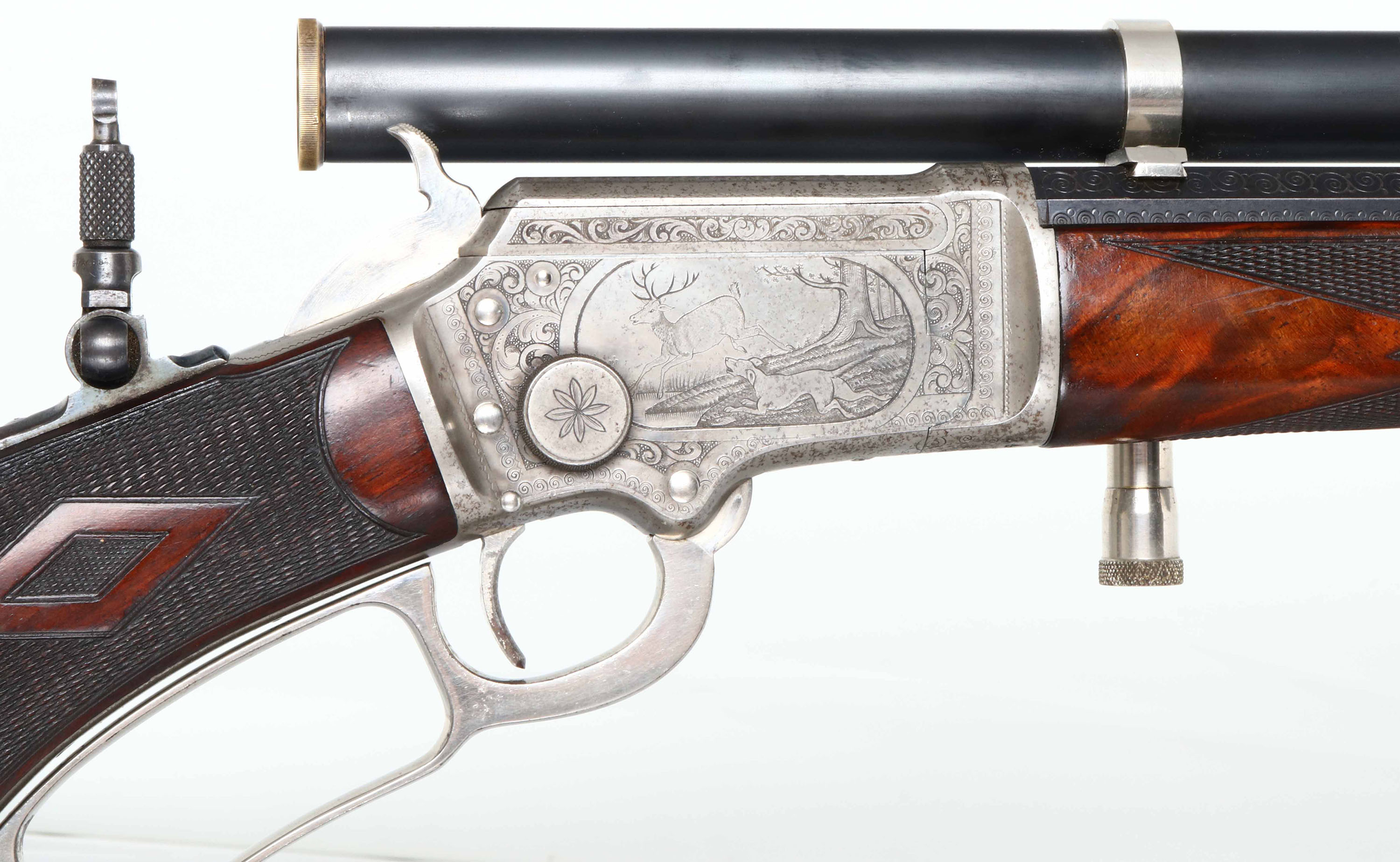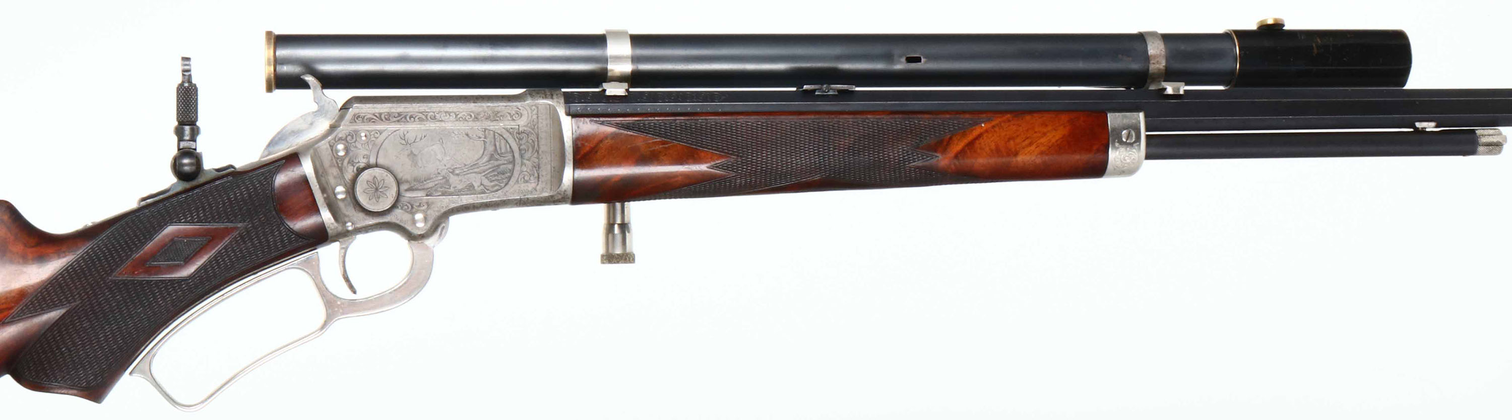EXTRODINARY FACTORY ENGRAVED & DELUXE Marlin Model 1897 Rifle, .22 RF, MFG: 1902, SN: 246648, Lever Action Rifle, 26'' Tapered octagon barrel, 1/2 mag. This special order, extremely high-grade rifle features Factory No. 3 engravings, which includes a scroll engraved receiver with large game scene vignettes on either side. The rifle also carries extremely high-grade XXX Walnut stocks featuring deluxe No. ''F'' checkering & mounted with a nickel scroll & floral engraved Schuetzen Swiss buttplate, with the monogram the initials ''HEC'' superimposed over one another at center. The stock features a scalloped pistol grip & a graceful factory cheekpiece adorning the left side of the butt. The buttstock & forend display fantastic feathered & fiery grain, accented beautifully with the finely carved diamond shapes of the ''F'' checkering pattern. The stocks carry the original high luster finish, with very few handling marks or rubs. The No. 3 engraved receiver features fabulous game scenes depicting a dog chasing a deer in a wooded scene on right, & buck & doe in a mountainous vignette on the left. Five flats of the barrel show 2 1/2'' of scroll engraving at the breech & the forend cap also displays decorative accent scroll engraving. The condition of the metal is very fine, with the barrel & magazine retaining 95% of the original factory blue finish. The case-hardened action shows mellowing of original case-colors, which has toned to a smoky pewter color, with muted colors remaining mostly on the left side of receiver & in protected areas. The receiver also shows scattered small specks of oxidation staining. The forend cap, Swiss buttplate, lever & hammer all retain 98% bright original nickel plated finish, with some light oxidation. The top of the barrel is marked ''Marlin Firearms Co. NEW-HAVEN CT., U.S.A. / PATD NOV. 19. 1878. APRIL 2. 1889. AUG. 12. 1890. MAR. 1, 1892.'' & floral scroll engraving at the rear. The underside of the receiver is marked with the SN ''246648''. The inside of the frame is marked ''PAT. JUNE 8, 1897''. The top of the receiver has a single hole neatly drilled & tapped, with filler screw present obscuring part of the ''MA'' in the engraved MARLIN SAFETY''. The upper tang is marked ''MODEL / 1897''. Bore is excellent & bright. The rifle is equipped with a period & likely original Cataract Tool & Optical telescopic sight mounted on their proprietary adjustable scope mounts, which are very nicely accented with nickel plating to compliment the other nickeled features on the rifle. Stevens purchased Cataract Tool & Optical in 1901 & this rifle was made in 1902. Interestingly, the front sight is a windgauge folding sporting sight by Stevens, which leads to the assumption that the scope & front sight were supplied at the same time by Stevens. The rear sight is a two leaf folding sight & the receiver is fitted with a Lyman tang peep. The scope is mounted in dovetails cut into the top flat of the barrel & the rear adjustment device is also mounted on a plate mounted to the left side of the barrel with a square notch neatly cut into the forend. The metal condition of the scope & mounts is excellent, commensurate with the balance of the rifle. The lenses are cloudy with some visibility & would likely benefite from a proper cleaning. The rifle has all matching SNs in addition to the receiver stamping, ncluding in the top tang inlet of the stock, the left side of the upper tang & on underside of buttplate. Action is crisp & smooth. What a fabulous rifle remaining in all original condition. Again, this is an exceptionally rare & extremely fine Marlin rifle that should excite any Marlin enthusiast. It is truly investment quality & clearly one of the finest Marlin rifles we have ever offered. FFL or C&R Req. - Value: 20000 to 35000