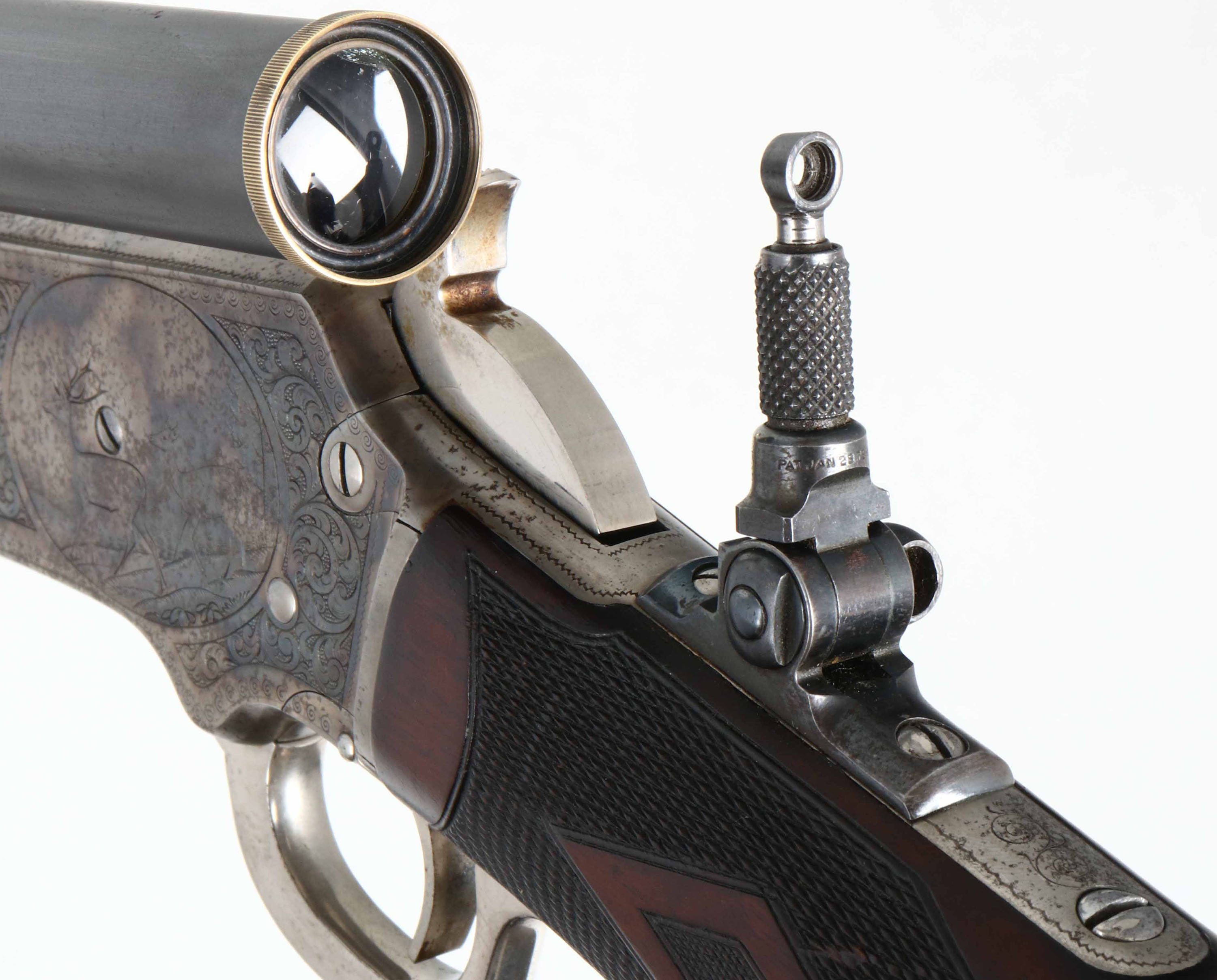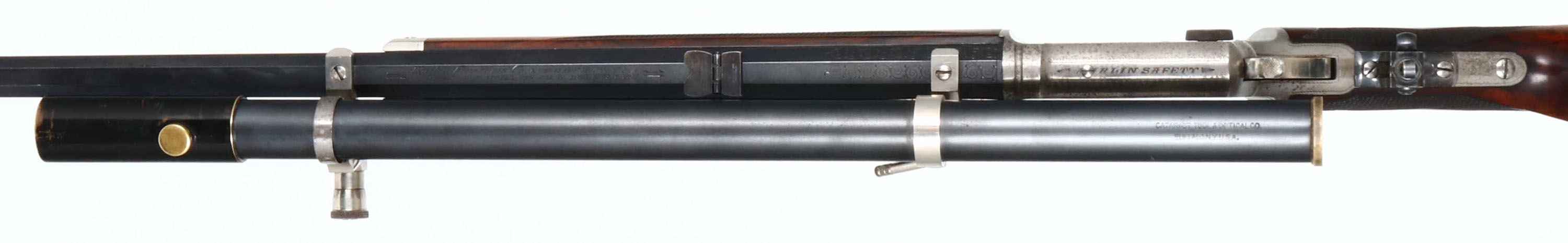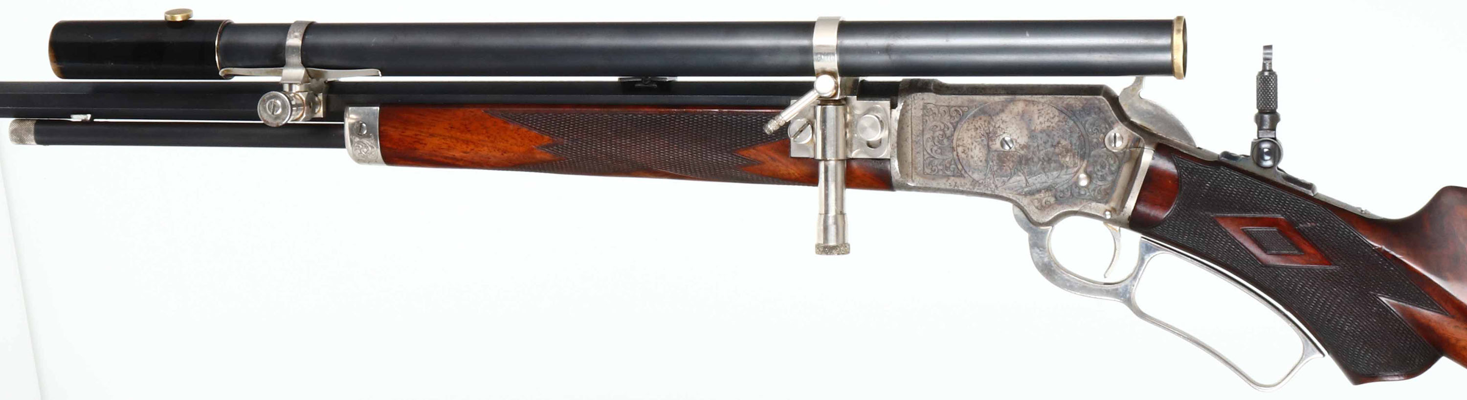 EXTRODINARY FACTORY ENGRAVED & DELUXE Marlin Model 1897 Rifle, .22 RF, MFG: 1902, SN: 246648, Lever Action Rifle, 26'' Tapered octagon barrel, 1/2 mag. This special order, extremely high-grade rifle features Factory No. 3 engravings, which includes a scroll engraved receiver with large game scene vignettes on either side. The rifle also carries extremely high-grade XXX Walnut stocks featuring deluxe No. ''F'' checkering & mounted with a nickel scroll & floral engraved Schuetzen Swiss buttplate, with the monogram the initials ''HEC'' superimposed over one another at center. The stock features a scalloped pistol grip & a graceful factory cheekpiece adorning the left side of the butt. The buttstock & forend display fantastic feathered & fiery grain, accented beautifully with the finely carved diamond shapes of the ''F'' checkering pattern. The stocks carry the original high luster finish, with very few handling marks or rubs. The No. 3 engraved receiver features fabulous game scenes depicting a dog chasing a deer in a wooded scene on right, & buck & doe in a mountainous vignette on the left. Five flats of the barrel show 2 1/2'' of scroll engraving at the breech & the forend cap also displays decorative accent scroll engraving. The condition of the metal is very fine, with the barrel & magazine retaining 95% of the original factory blue finish. The case-hardened action shows mellowing of original case-colors, which has toned to a smoky pewter color, with muted colors remaining mostly on the left side of receiver & in protected areas. The receiver also shows scattered small specks of oxidation staining. The forend cap, Swiss buttplate, lever & hammer all retain 98% bright original nickel plated finish, with some light oxidation. The top of the barrel is marked ''Marlin Firearms Co. NEW-HAVEN CT., U.S.A. / PATD NOV. 19. 1878. APRIL 2. 1889. AUG. 12. 1890. MAR. 1, 1892.'' & floral scroll engraving at the rear. The underside of the receiver is marked with the SN ''246648''. The inside of the frame is marked ''PAT. JUNE 8, 1897''. The top of the receiver has a single hole neatly drilled & tapped, with filler screw present obscuring part of the ''MA'' in the engraved MARLIN SAFETY''. The upper tang is marked ''MODEL / 1897''. Bore is excellent & bright. The rifle is equipped with a period & likely original Cataract Tool & Optical telescopic sight mounted on their proprietary adjustable scope mounts, which are very nicely accented with nickel plating to compliment the other nickeled features on the rifle. Stevens purchased Cataract Tool & Optical in 1901 & this rifle was made in 1902. Interestingly, the front sight is a windgauge folding sporting sight by Stevens, which leads to the assumption that the scope & front sight were supplied at the same time by Stevens. The rear sight is a two leaf folding sight & the receiver is fitted with a Lyman tang peep. The scope is mounted in dovetails cut into the top flat of the barrel & the rear adjustment device is also mounted on a plate mounted to the left side of the barrel with a square notch neatly cut into the forend. The metal condition of the scope & mounts is excellent, commensurate with the balance of the rifle. The lenses are cloudy with some visibility & would likely benefite from a proper cleaning. The rifle has all matching SNs in addition to the receiver stamping, ncluding in the top tang inlet of the stock, the left side of the upper tang & on underside of buttplate. Action is crisp & smooth. What a fabulous rifle remaining in all original condition. Again, this is an exceptionally rare & extremely fine Marlin rifle that should excite any Marlin enthusiast. It is truly investment quality & clearly one of the finest Marlin rifles we have ever offered. FFL or C&R Req. - Value: 20000 to 35000