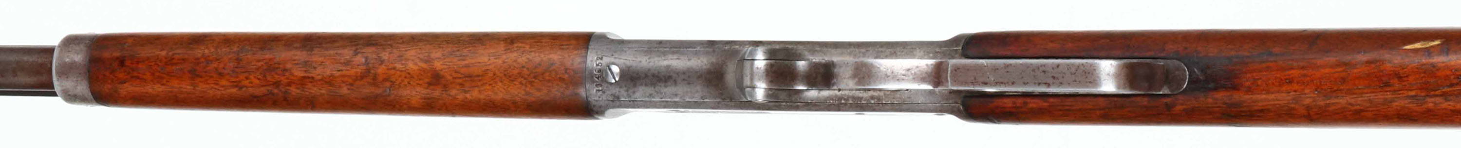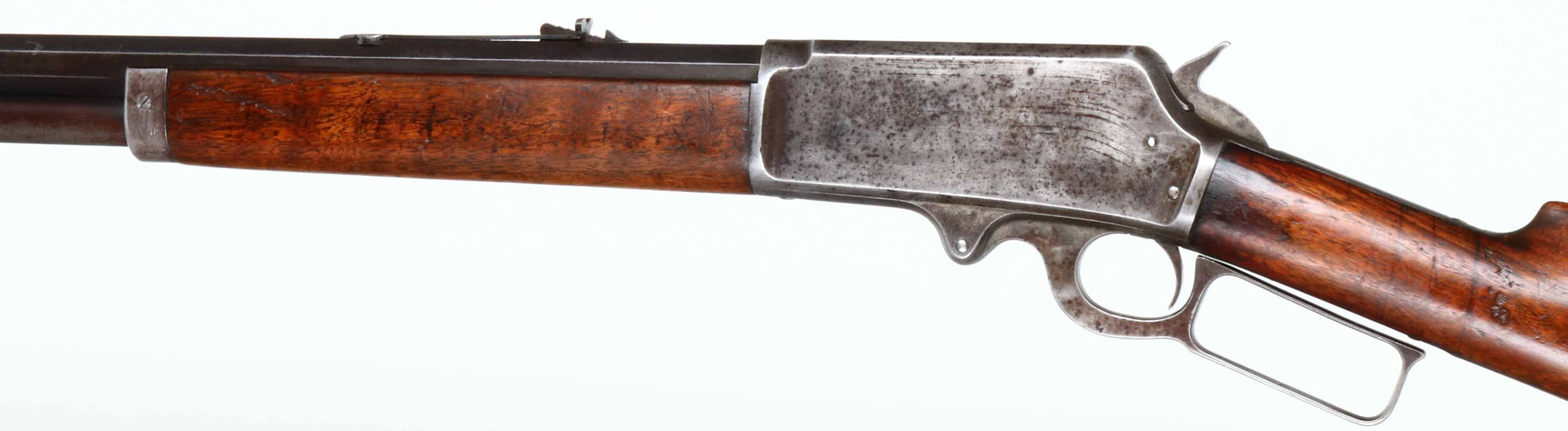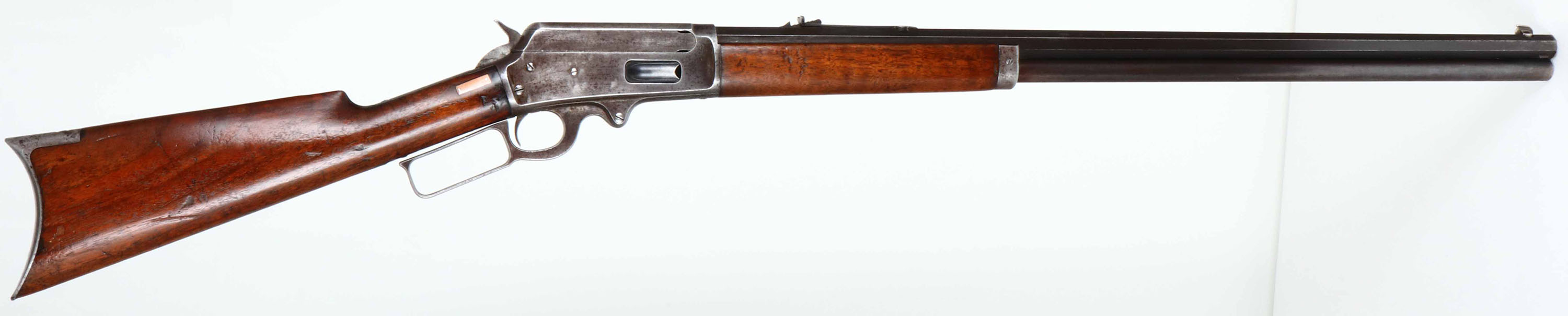 VERY RARE Marlin Model 1895, CAL 50-110, MFG: 1896, SN: 134652, Lever Action Rifle, 28 1/4'' Octagon barrel, Full mag. Early second year rifle. The 50-110 was not a cataloged caliber for the 1895. The rifle would had to be special ordered from the custom shop & while other 50-110 examples have come to auction over the last 20 years, there could not have been many produced. The straight grip wood stocks are excellent & solid, carrying the original factory finish & some protective oils. They displaying several small nicks, scratches & contusions. The right wrist carries a small rectangular, inlaid & pinned brass plate, unknown purpose. The metal blue finish on the barrel & mag has toned to a gray/brown patina, with 50% coverage. The case-hardened receiver, lever & hammer have all toned mostly gun metal gray, with a thin layer of brown patina. Bore is excellent. Barrel carries an adjustable rear & blade front sight. Buttstock carries a smooth crescent metal buttplate. An overall excellent & early 2nd yr example in the rare 50-110 caliber.* Antique, No FFL Req - Value: 4000 to 7000