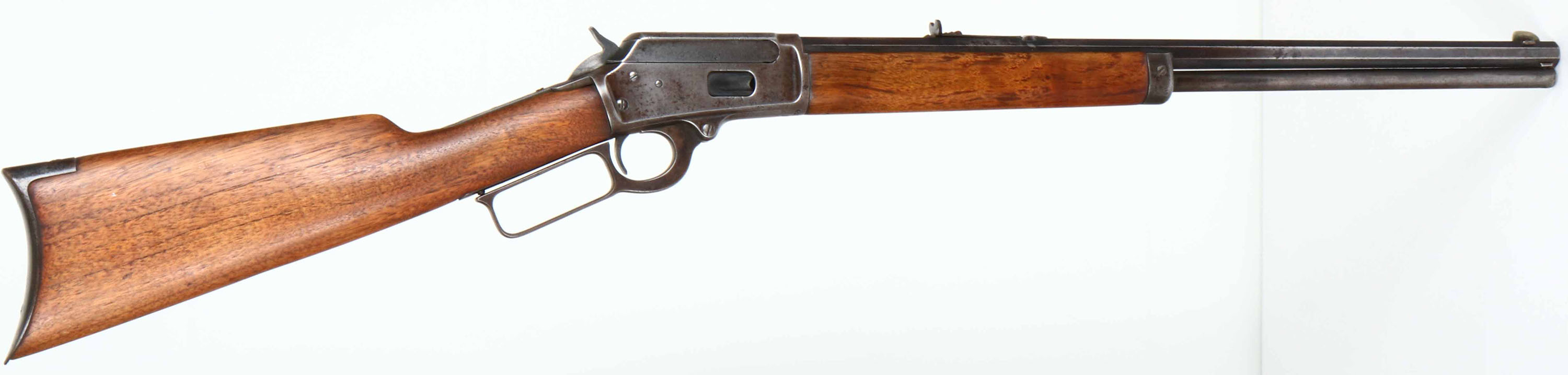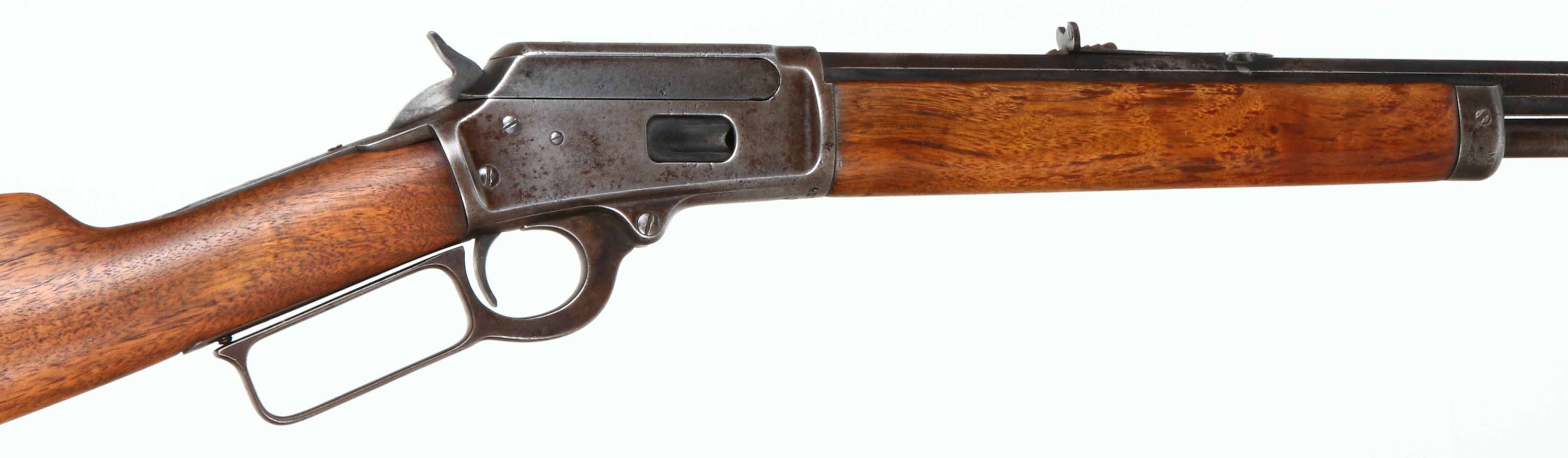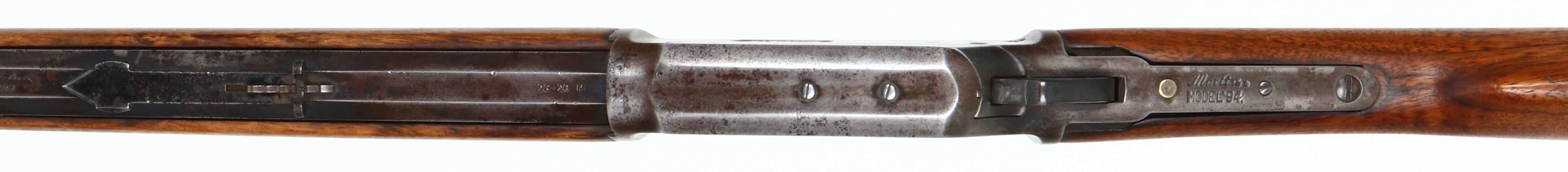Marlin, Model 1894, Marked .25-20 Cal., MFG. 1910-20, SN: 427710, Lever Action Carbine, 20 1/2'' Octagon, Full mag., The straight grip wood stocks are good & solid, having been heavily sanded & reoiled. The stock have a few minor handling marks remaining. Metal is proud to wood at tangs, receiver & buttplate. The original metal blue finish on barrel & mag has worn to a mix of gun metal gray, remnants of blue & brown patina, with spotty areas of cleaned pitting. The receiver has worn to gun metal gray, with thin spots of brown patina. Some faint remains of the original case-colors on the case-hardened lever. Barrel carries an adjustable rear & blade front sights, with cleaned pitting on the rear sight. One of the tang screw holes has a brass filler pin. Stock carries a crescent metal buttplate. Bore is poor with heavy pitting & scarring amonst faint rifling. Tight action. Popular little caliber for varmint hunting. FFL or C&R Req. - Value: 200 to 400
