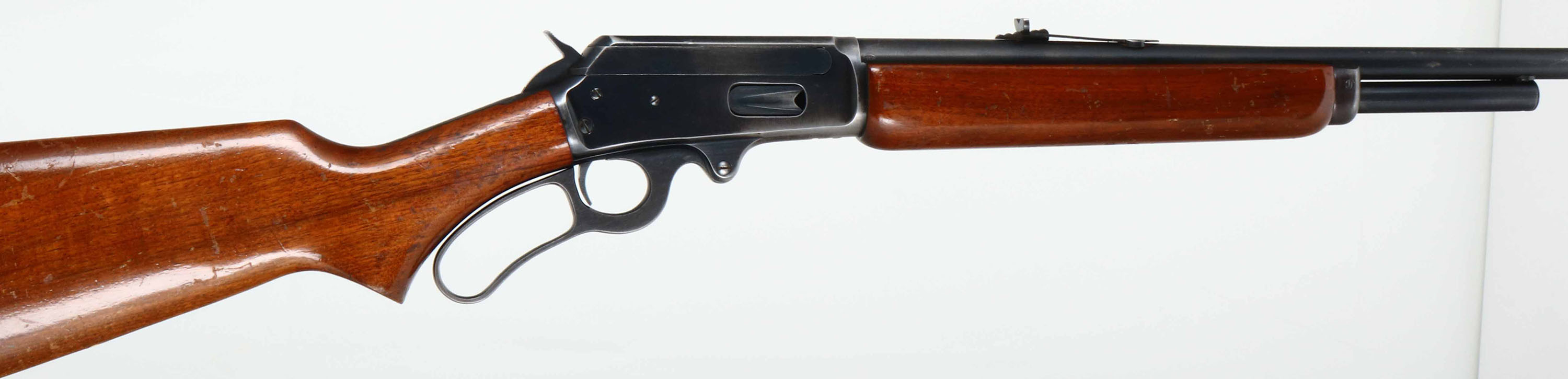Marlin, Model 36 Standard rifle w/A-DL barrel stamping, CAL: 30-30, MFG: 1947, SN: D14500, Lever Action Rifle, 24'' barrel, 2/3rd mag. The original flat pistol grip wood stocks are very good, but with lots of flaking, scrapes & dings to the original finish. The original metal blue finish rates 85% on barrel & mag, 70% on receiver. Bore is excellent. The barrel carries the original adjustable rear & ramp elevated front sights. Stock carries a plastic buttplate. A great lever action 30-30 hunting rifle. FFL or C&R Req. - Value: 400 to 800
