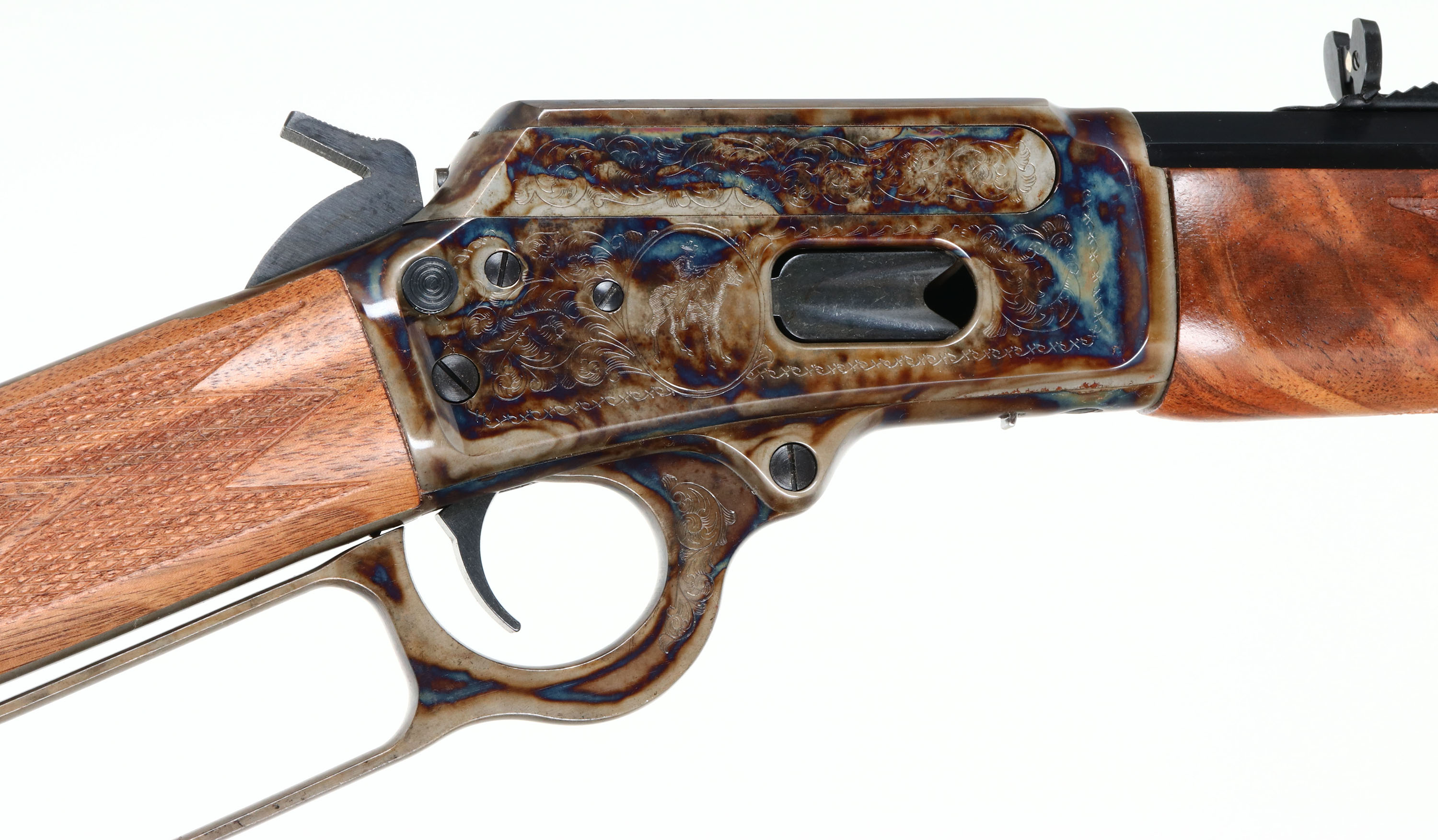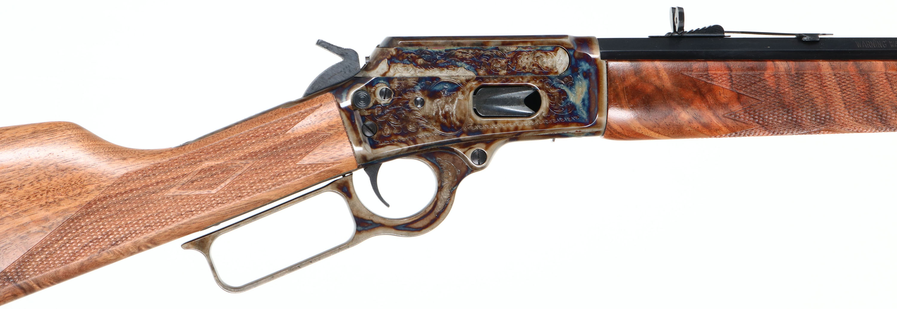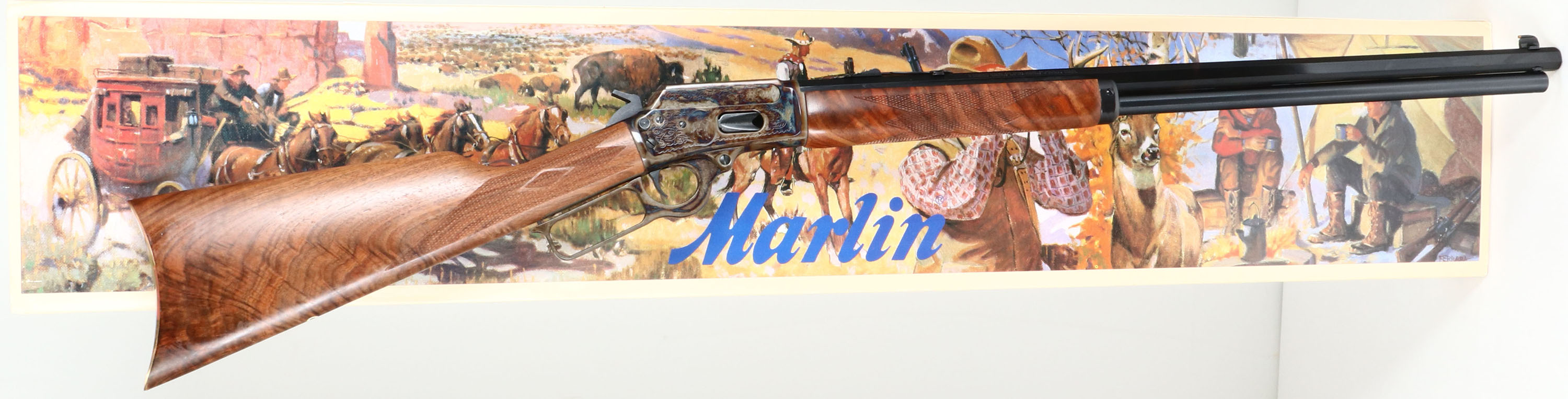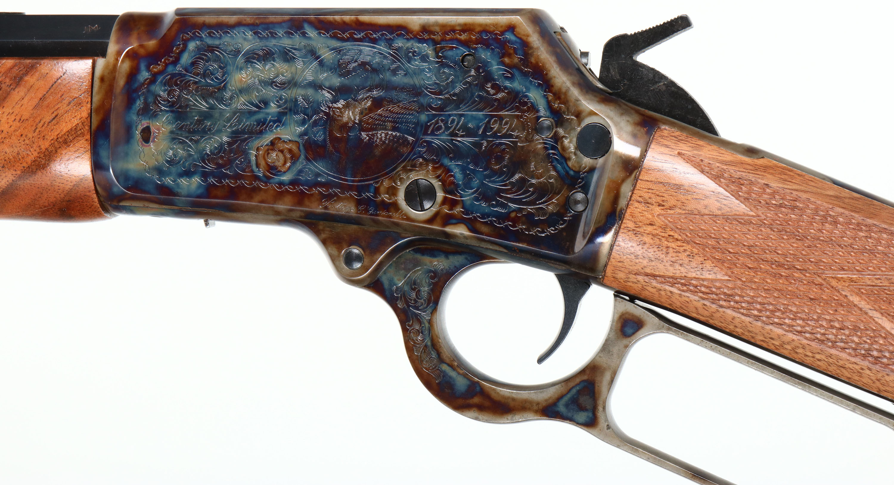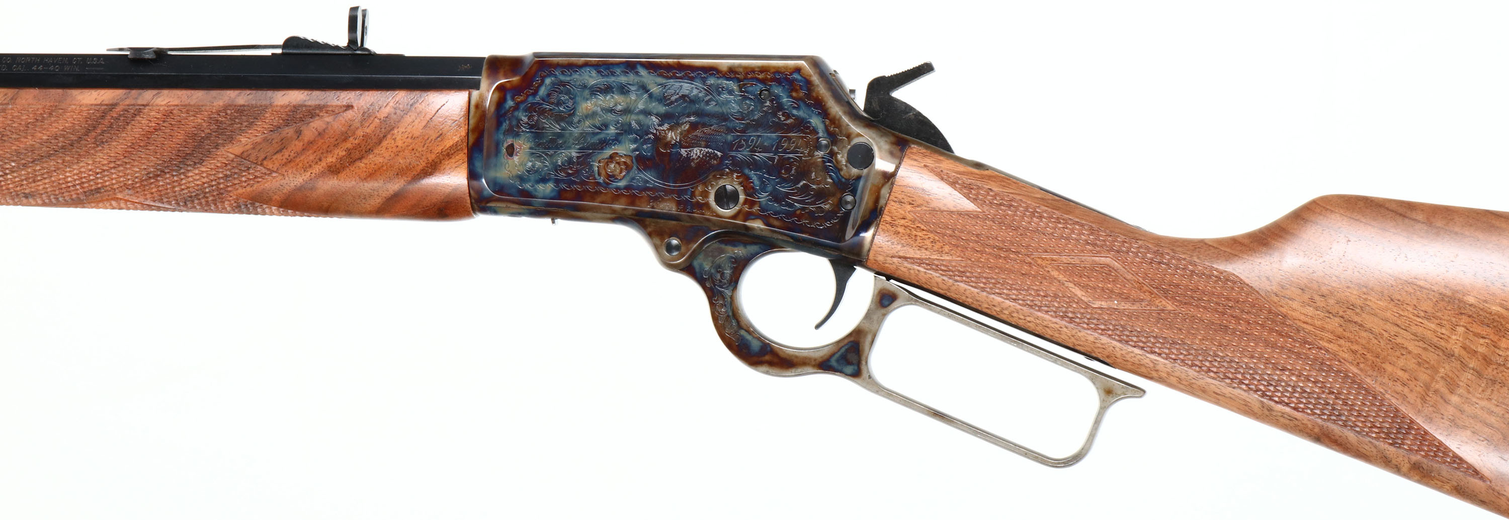 NEW BOXED, Marlin, 1894 Century Limited, 100 Year Anniversary. CAL: .44-40, MFG: 1994, SN: 94CL1638, Lever Action Rifle , 24'' Octagon barrel. Full Mag. Both sides of the case-hardened receiver & lever feature foliate engraving. The left side of the receiver has ''Century Limited 1894-1994'', an engraved buck, & signature of engraver ''Bottega C. Giovanelli'' at the bottom. The right side has the Marlin horse back rider engraved. The upper tang is marked with the serial number. The top of the receiver has foliate engraving & is marked ''MARLIN SAFETY''. The stocks are two-piece checkered walnut with an oiled finish, capped forearm, straight grip & comb, & a crescent brass buttplate. The buttstock has the ''Marlin Bullseye'' in the belly. The metal blue finish rates 100% overall. The receiver displays vivid case-colors. Bore is mint. Barrel carries factory buckhorn rear & front blade sights. Comes in original matching box, with packaging & paperwork. NOS. A fantastic commemorative rifle. FFL Req. - Value: 1000 to 2000