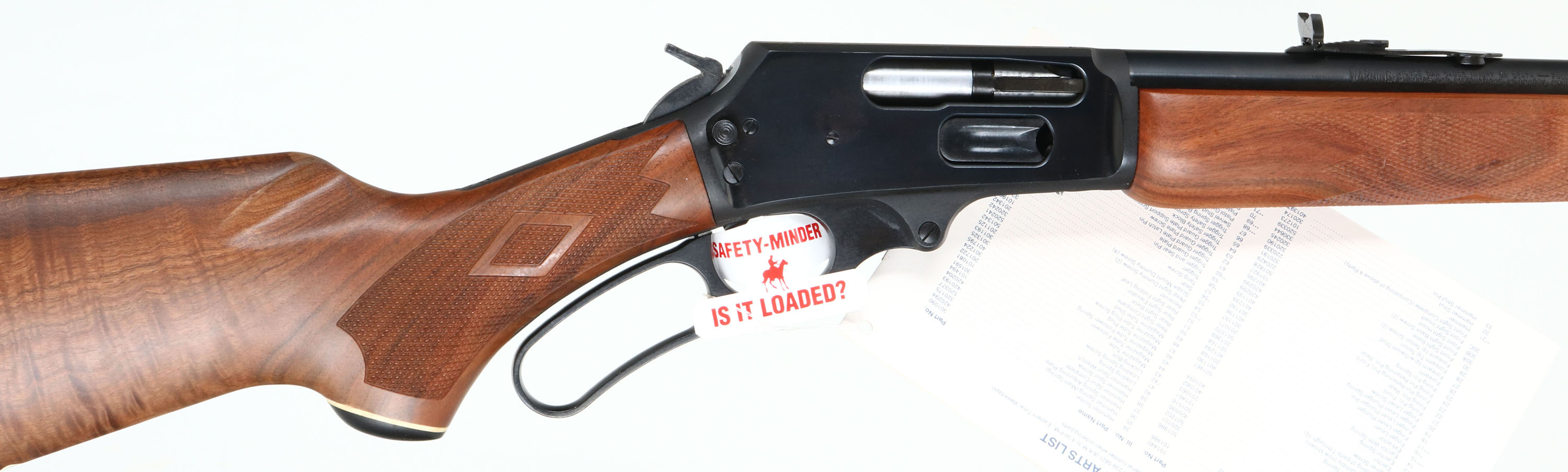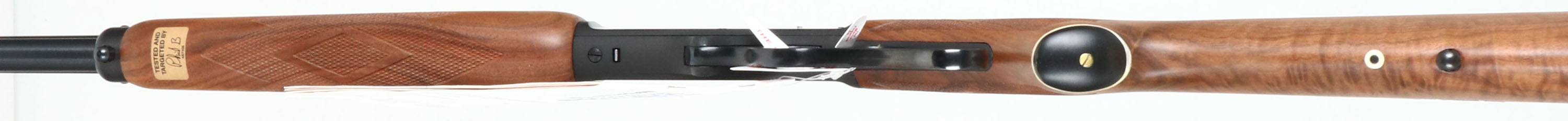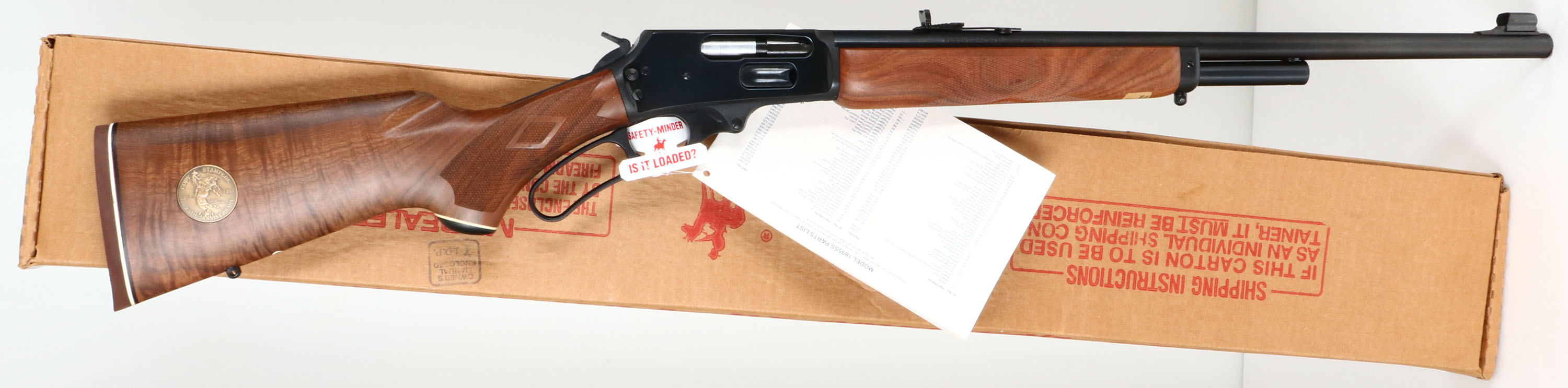NEW BOXED, Marlin, 1895 Cody, Cody Stampede 75th Aniversary Commemorative, CAL: .45/70 Gov'T, MFG: 1994, SN: CODY0034, Lever Action Rifle , 21'' Round barrel. 2/3 Mag. A special edition, one year only (1994), one of only 200 produced. This rifle displays a Cody Stampede 75th Anniversary medallion in the deluxe fancy checkered stock. The stocks are two-piece checkered walnut with an oiled finish, capped forearm, capped pistol grip, straight comb, & a Marlin solid recoil pad. The buttstock has the ''Marlin Bullseye'' in the belly. The metal blue finish rates 100% overall. Barrel carries an adjusting folding leaf rear & hooded front blade sights. Sling studs. Hanging owners manual & trigger safety notice still on gun. Comes in original matching box, with packaging, paperwork & tool. A wonderful Limited Edition rifle, in new old stock (NOS) condition. FFL Req. - Value: 1000 to 1500