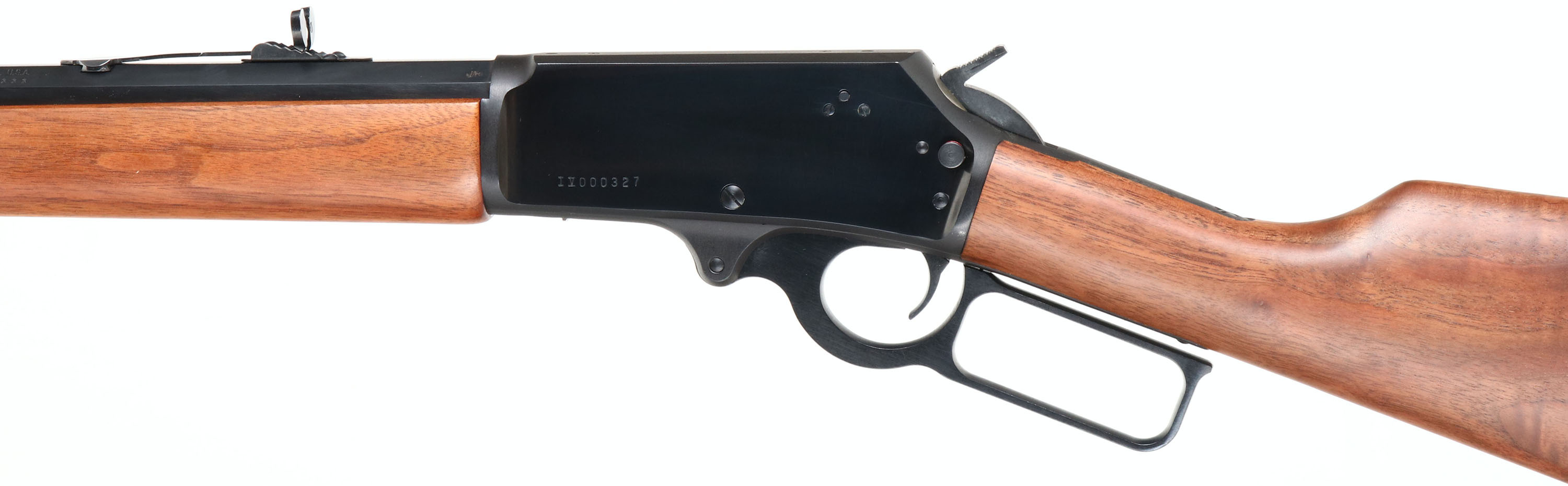 NEW BOXED, Marlin, 1895 LTD- IV, CAL: .45/70 Gov'T, MFG: 2000, SN: IV000327, Lever Action Rifle, 24'' Tappered octagon barrel. Full Mag. A Limited Edition Rifle. The stocks are two-piece checkered walnut with rippled grain & an oiled finish, capped forearm, straight grip, straight comb, & a Marlin buttplate. The buttstock has the ''Marlin Bullseye'' in the belly. The metal blue finish rates 100% overall. Barrel carries an adjusting buckhorn rear & front blade sights. Comes in original matching box, with packaging, letter, paperwork, lock & tool. A fantastic Limited Edition rifle, in new old stock (NOS) condition. FFL Req. - Value: 800 to 1500