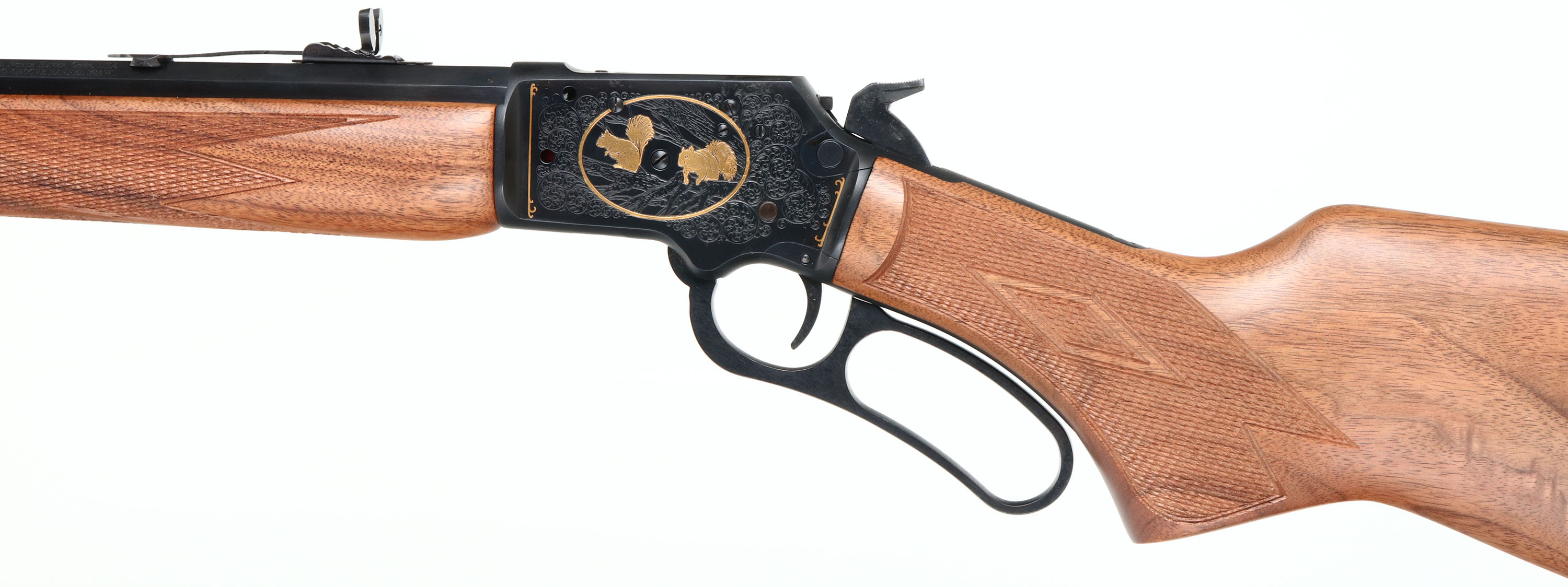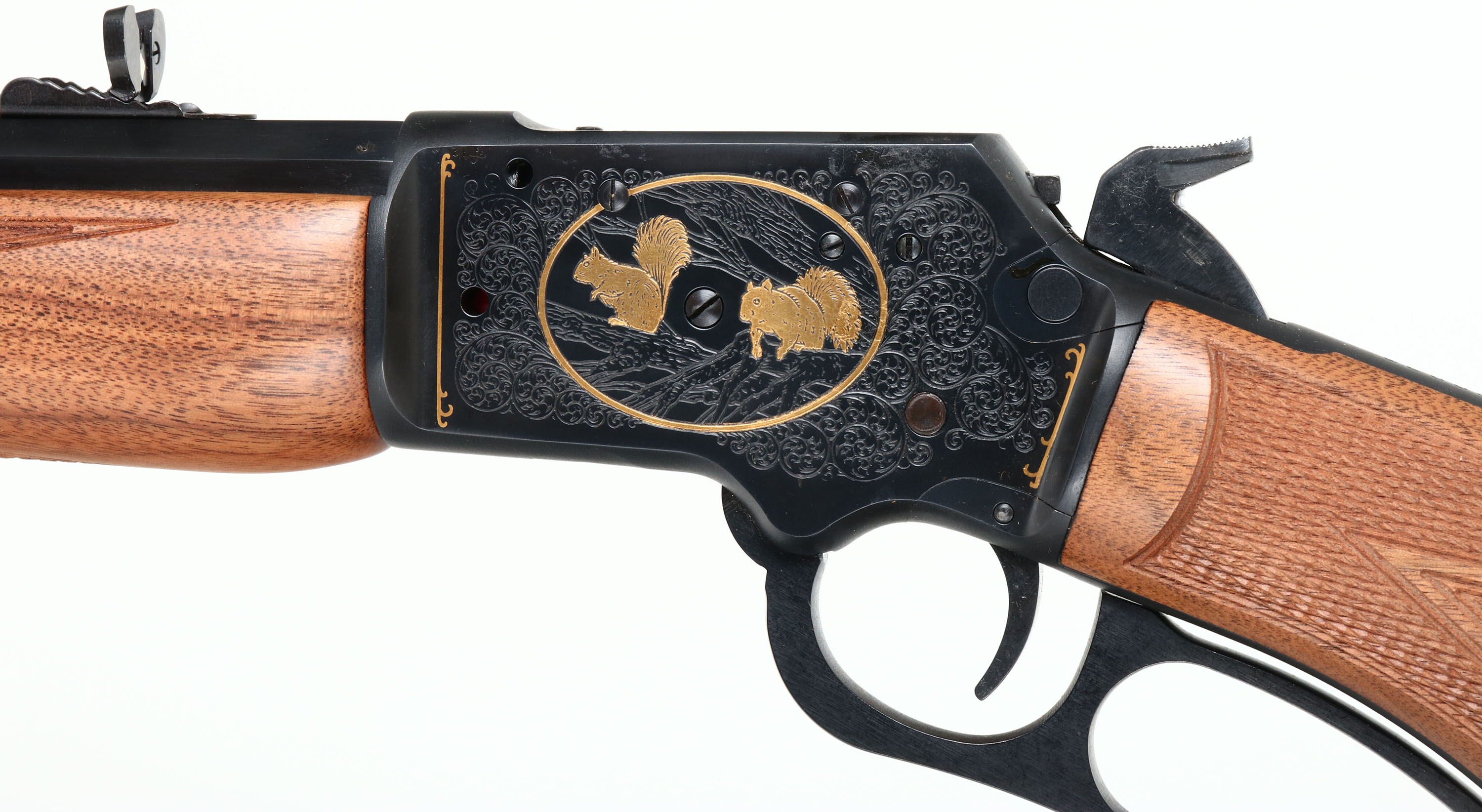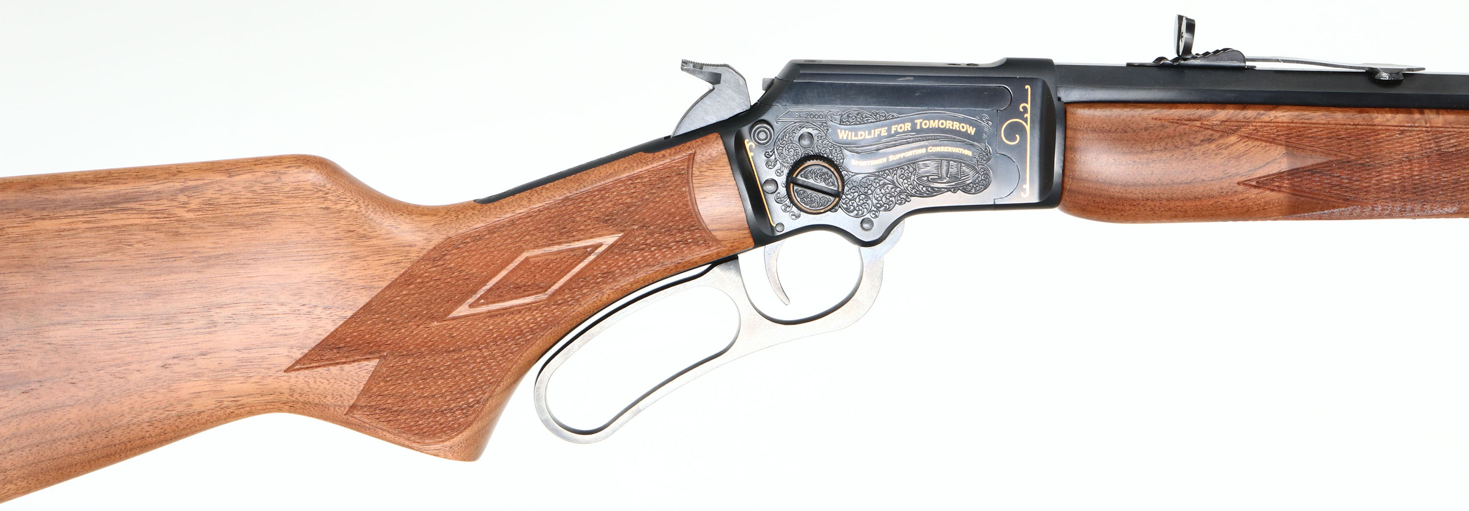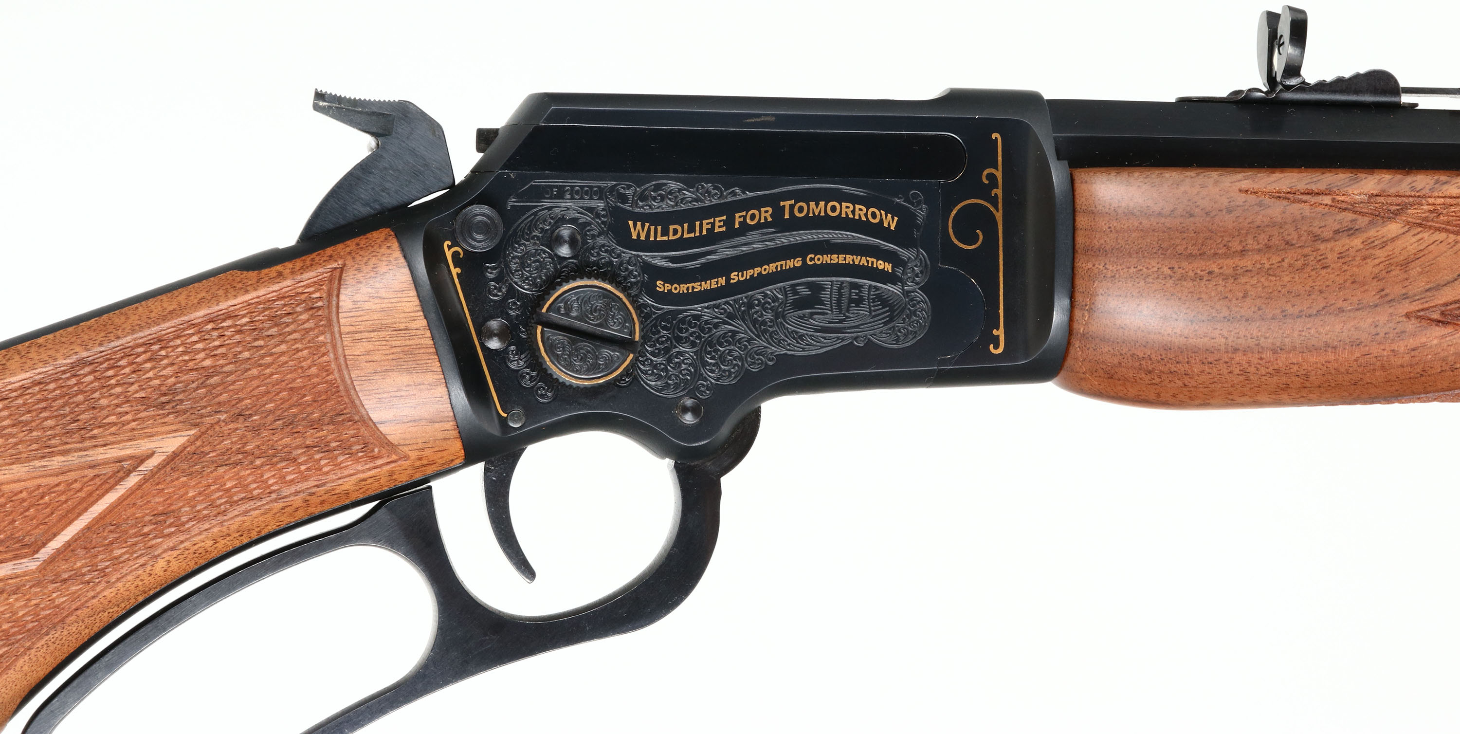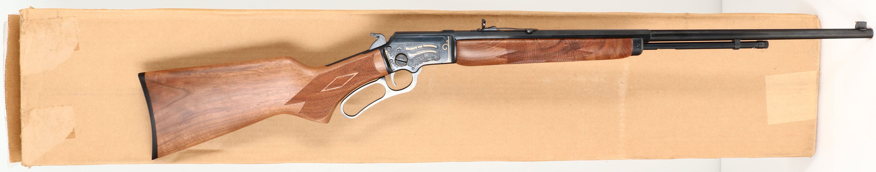 NEW BOXED, Marlin, 39 AWL Engraved, CAL: .22 S.L.LR, MFG: 1997, SN:WL000389, Lever Action Rifle, 24'' Tappered 1/2 octagon 1/2 round barrel. 2/3 Mag. A Limited Edition rifle made exclusively for Wal-mart, supporting the Wildlife Management Institution & Wildlife Forever. MFG just one year (1997), one of only 2000 produced. Featuring gold, game & foliate engraving. The right side of the receiver has banners with gold lettering ''WILDLIFE FOR TOMORROW'' & ''SPORTSMAN SUPPORTING CONSERVATION'', & scroll engraving. The left side has two gold squirrels & scroll engravings. The stocks are two-piece checkered black walnut, with semi-deluxe grain & an oiled finish, capped forearm, flat pistol grip, straight comb, & a Marlin buttplate. The metal blue finish rates 100% overall. Barrel carries an adjusting buckhorn rear & front blade sights. Comes in original matching box, with packaging, paperwork & packaged scope rail. An excellent Limited Edition collectible, in new old stock (NOS) condition. FFL Req. - Value: 1000 to 1500