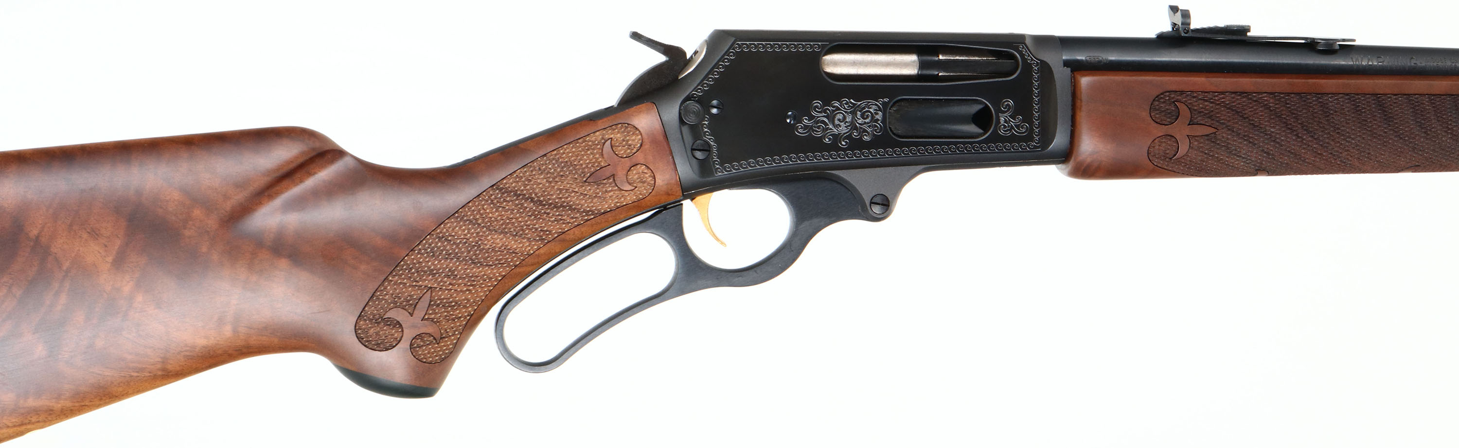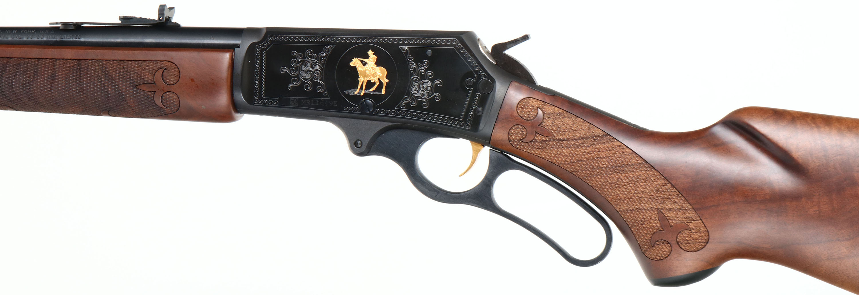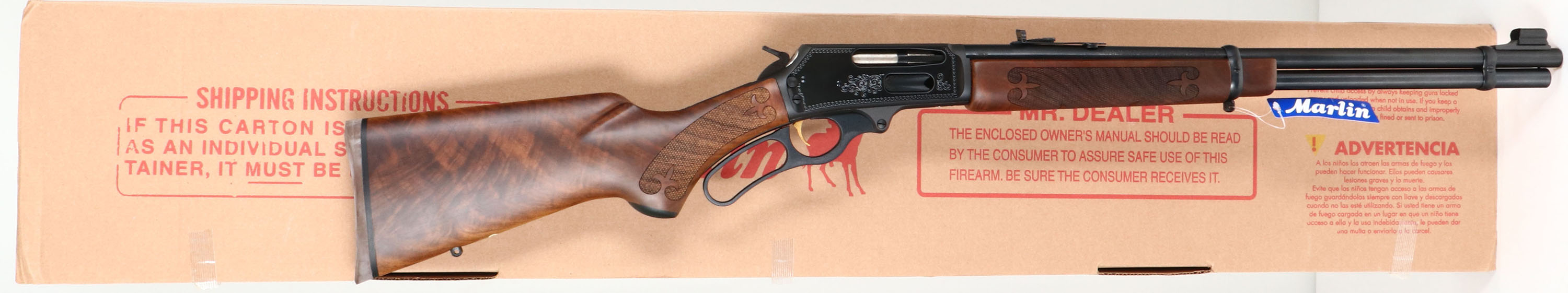 NEW BOXED, Marlin, 336 C LTD1, CAL: .30-30, MFG: Modern, SN: MR11649E, Lever Action Rifle, 20'' Tappered round barrel. Full Mag. A Limited Edition rifle, the first of a multi-year series, mfg. just one year (2014), one of only 1500 produced. Featuring a 24K gold Marlin horse back rider & foliate scroll engraving. Stocks are two-piece, ''B'' grade checked, an oiled finish, capped forearm, cap pistol grip, straight comb, deluxe grain black walnut & a Marlin buttpad. The buttstock has the ''Marlin Bullseye'' in the belly. The original metal blue finish rates 100% overall. Barrel carries an adjustable folding buckhorn rear & hooded front blade sights. Gold trigger. Sling studs. Hanging tag still on gun. Comes in original matching box, with packaging, paperwork, & lock. A great hunting rifle, in new old stock (NOS) condition. FFL Req. - Value: 800 to 1500