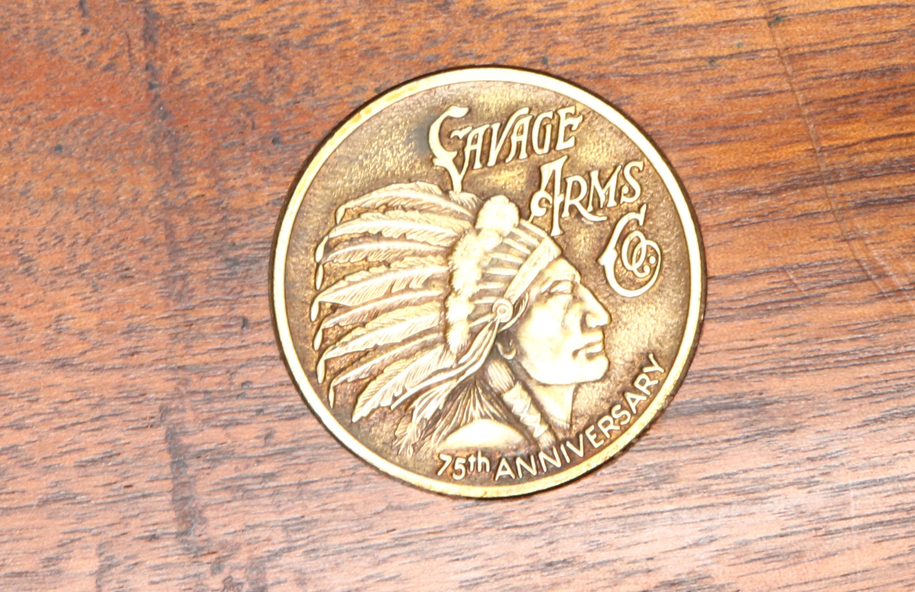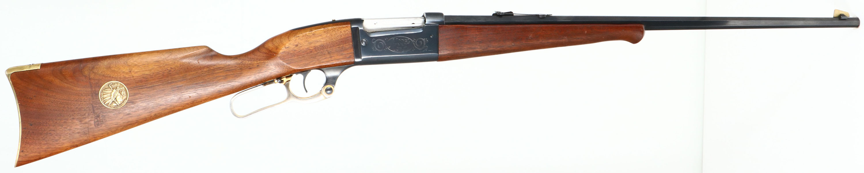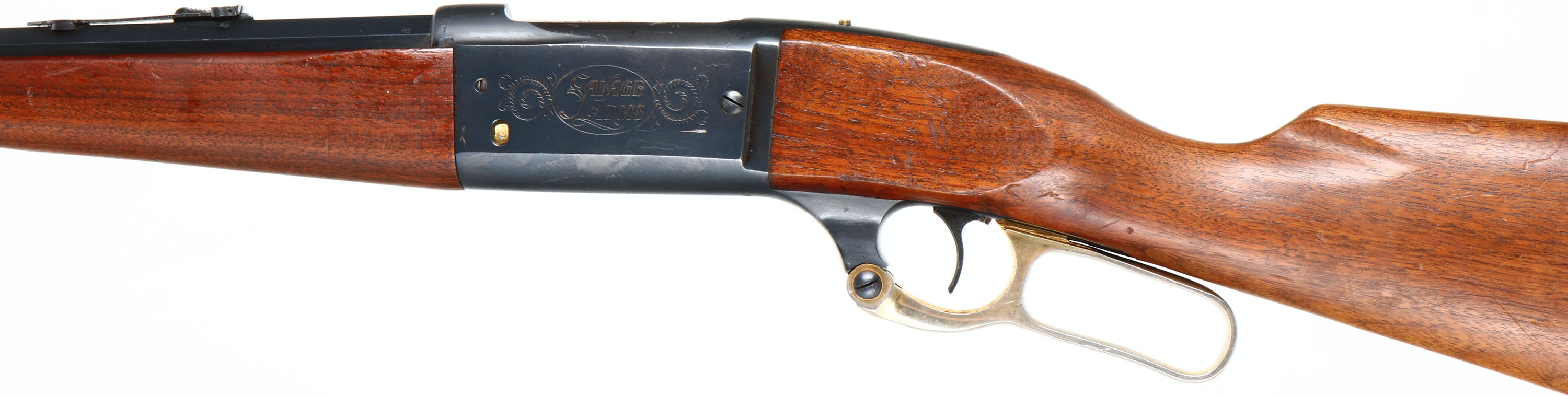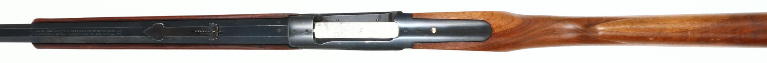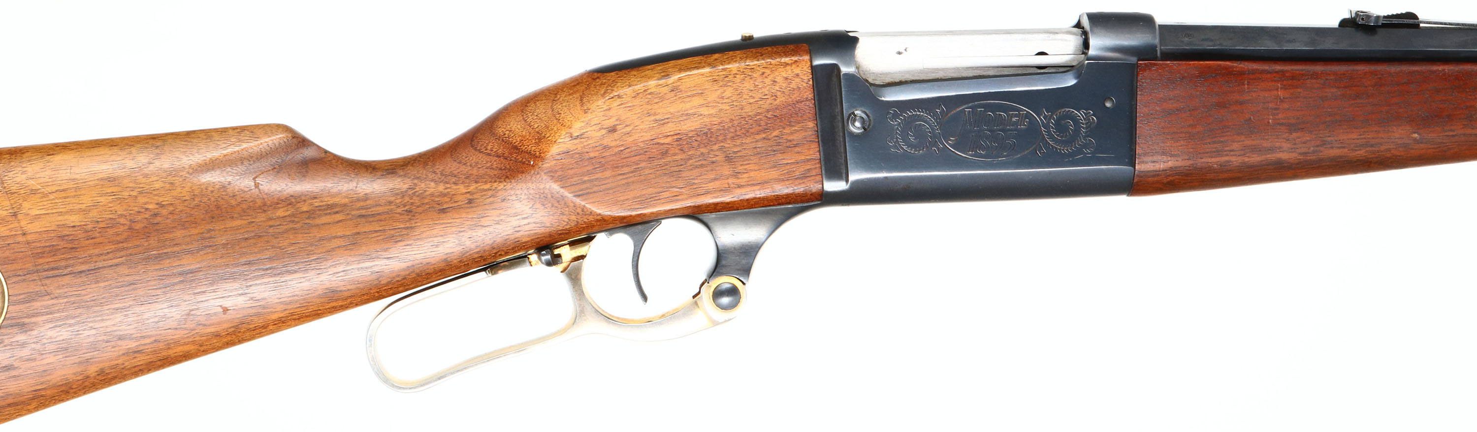 Savage, Model 1895, 75th Anniversary , CAL: marked 308 WIN, MFG: 1970, SN: 3721A5, Lever Action Rifle, 24'' Octagon barrel. The rifle celebrates the 75th anniverary of the 1895 rifle, which soon became the iconic 1899 & 99 rifles. Decorative gold washed engravings on the receiver. The straight grip walnut stocks are excellent. The wood retains the majority of the original finish, with a few minor handling marks or thin scratches. Schnabel forend & commemorative brass medallion embedded in the stock. The original metal blue finish on the barrel rates 95%, 90% on the receiver. Like the originals, round counter on the left side of receiver. Bore is excellent. The rifle is fitted with a flip-up leaf adjustable rear sight & brass blade front sight. Buttstock carres a brass crescent buttplate. The gold wash in the engravings has mostly worn away. The gold wash on the lever has also mostly worn to the nickeled underlayer. MFG 9,999 in 1970 only, but speculation is that less of them were actually produced & sold.* FFL or C&R Req. - Value: 600 to 1000