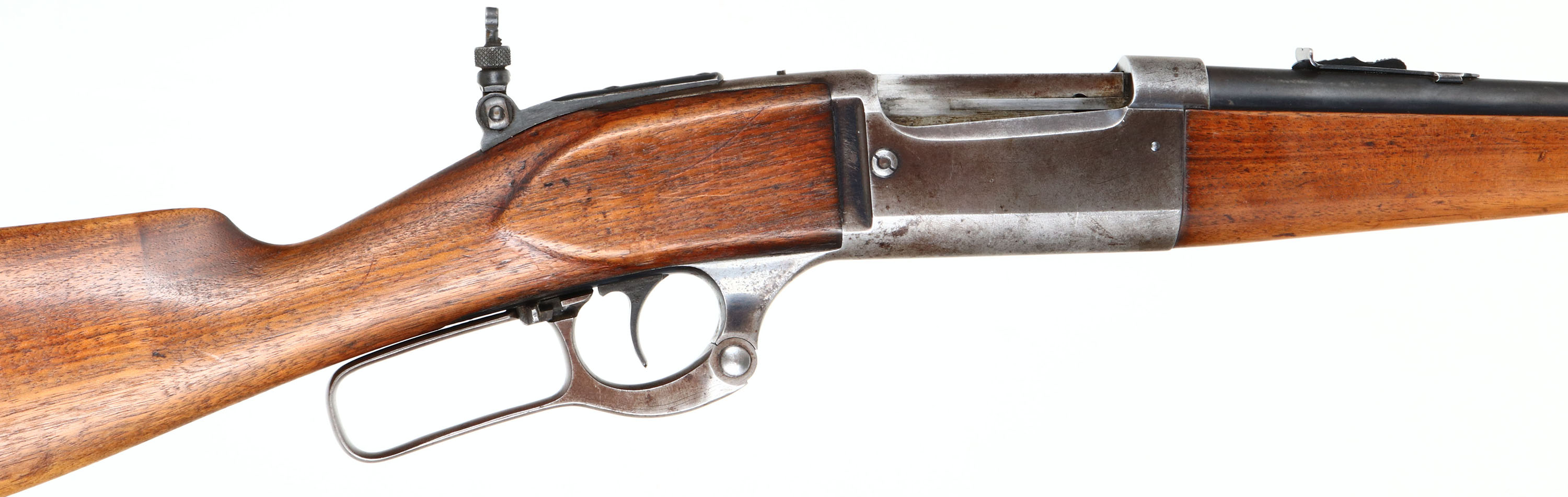 Savage Model 1899, CAL: 303 SAV, MFG: 1911, SN: 111717, Lever Action Rifle, 20'' Round barrel. The straight grip wood stocks are very good & solid. The stocks carry worn original finish, with scratches, contusions & scrapes. The metal blue finish on the barrel retains 70% coverage. The receiver has worn mostly to a gun metal gray, with areas having a thin brown patina. Bore is very good. The receiver carries a Lyman tang sight, while the barrel holds an adjustable rear sight & long blade front sight. Crescent metal buttplate. Smooth tight action. A good old vintage hunting rifle. FFL or C&R Req. - Value: 500 to 1000