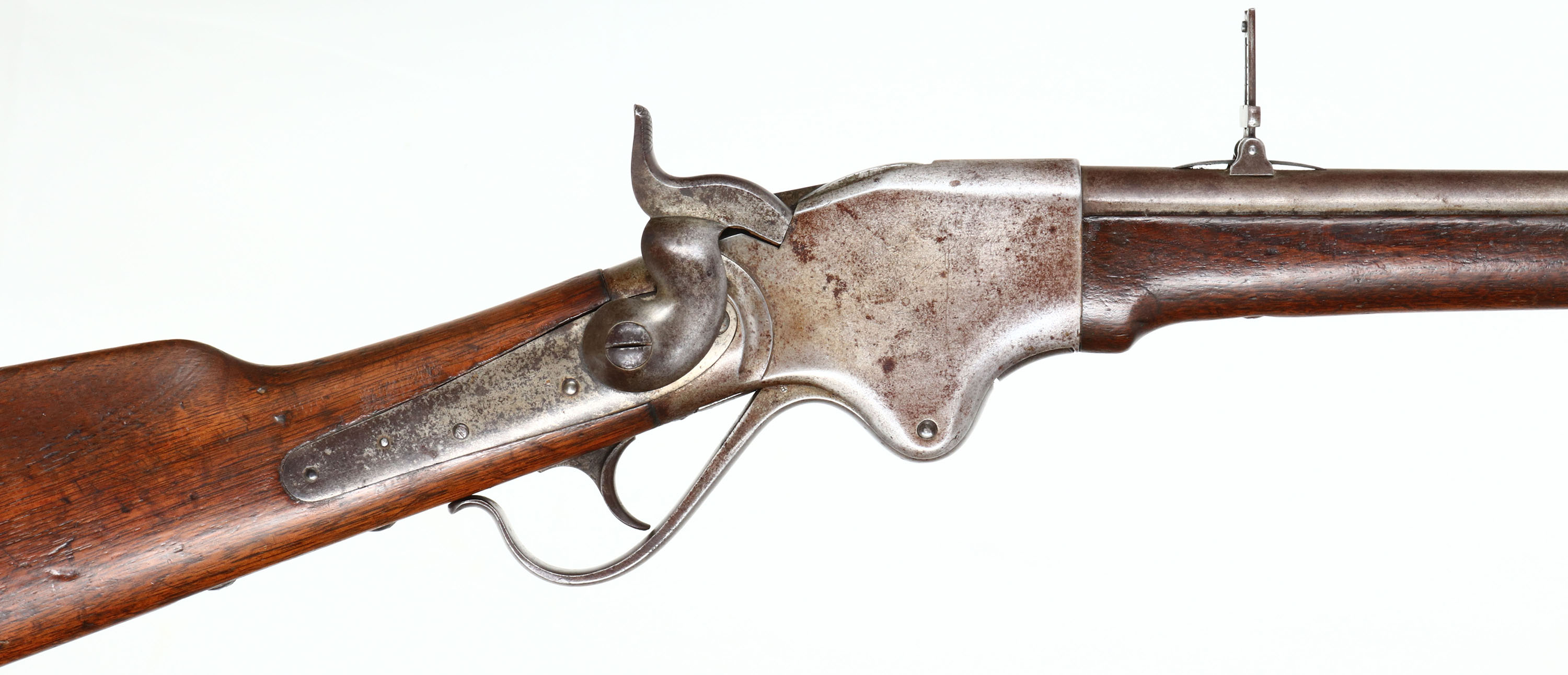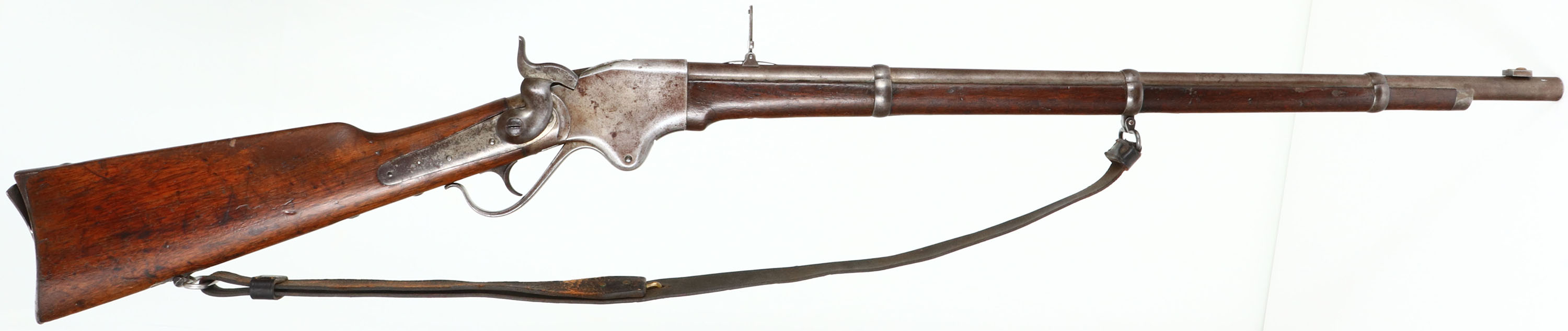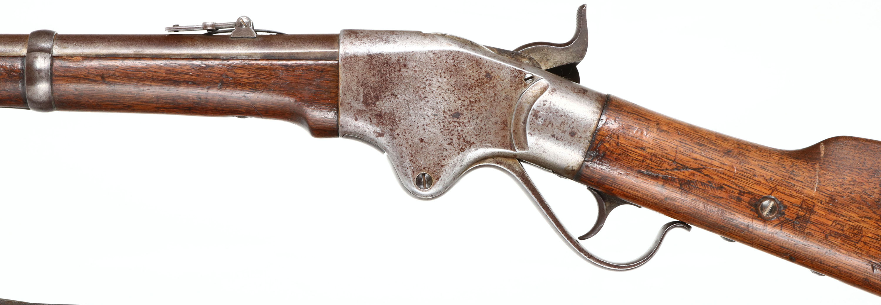 Spencer Repeating Rifle Co., Model Repating Rifle (ARMY), CAL: 56-56 (52 cal), MFG: 1860-69, SN: 23145, Lever Action Repeating Rifle, 30' barrel. By the end of the Civil War more than 144,000 Spencer rifles & carbines had been manufactured with over two-thirds of those purchased by the U.S. government. The three line address on the receiver reads: ''SPENCER REPEATING / RIFLE CO. BOSTON MASS/ PAT'D MARCH 6, 1860''. The original straight grip wood stocks are very good & solid. There are numerous small contusions, scrapes & dings consitent with military use. There are two faint cartouches on the left side of the stock behind the plate screw neither is fully legible. The stocks do not appear to be sanded & therefore appear to carry the original finish, with some added oils over time. The metal finish has worn to a mix of gun metal grey & a spotty thin layer of brown patina. Bore is very good & bright, but with some light pitting amongst proud rifling. Barrel carries a steel lug front sight with ivory blade (partially missing) & a folding ladder rear sight, with 2 to 8 graduations & 800 yard center notch. Smooth metal trapdoor buttplate, with internal mag tube. Sling loops carry a period leather sling. This rifle was likely used during Civil War &/or Indian/American Wars to follow. These are somewhat rare, a true piece of American history. Antique, No FFL Req. - Value: 3000 to 5000