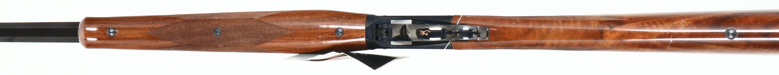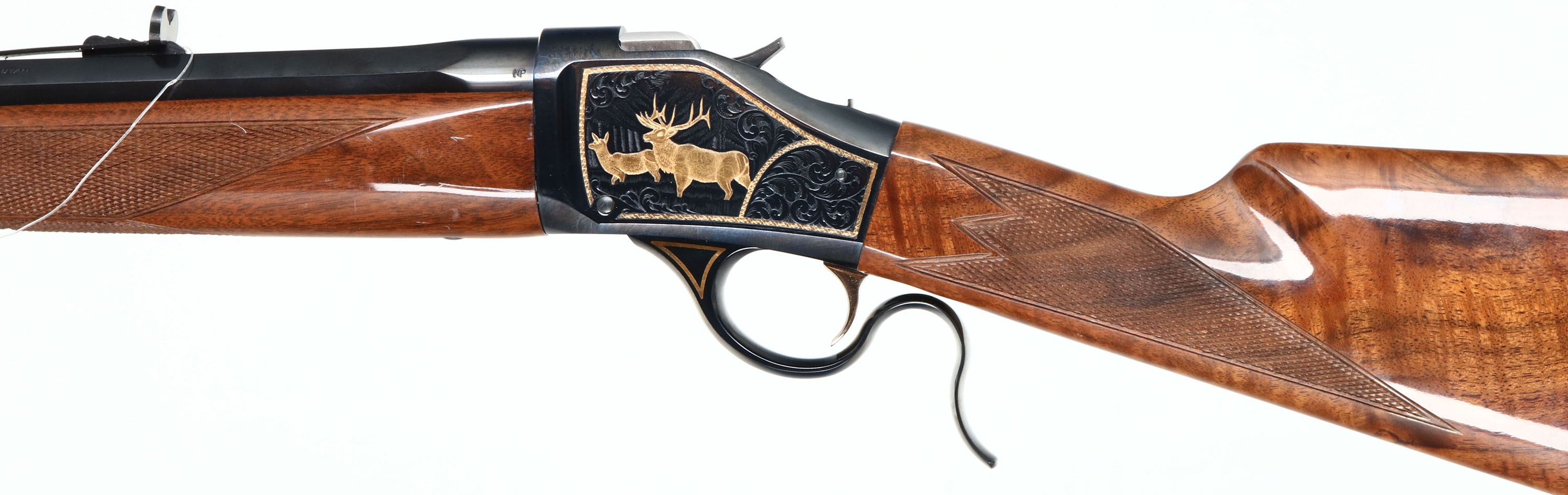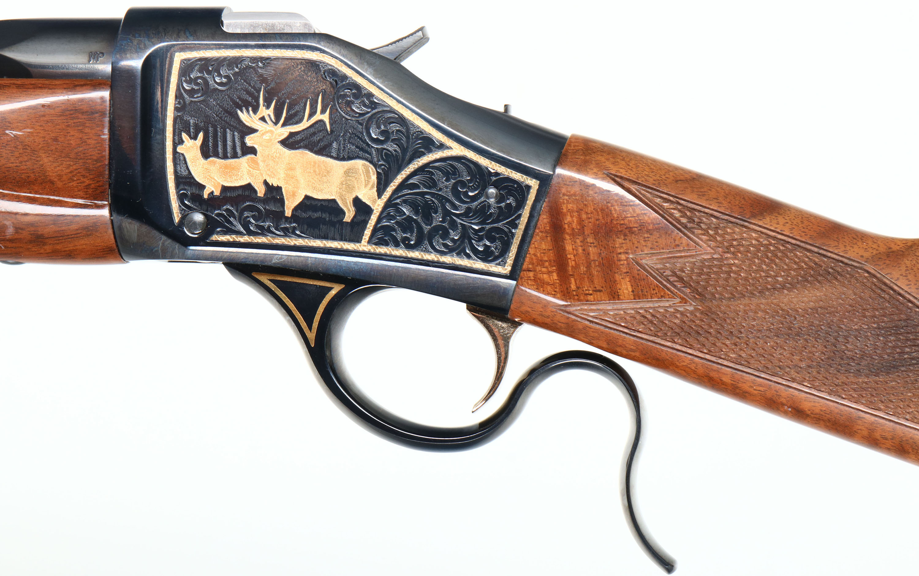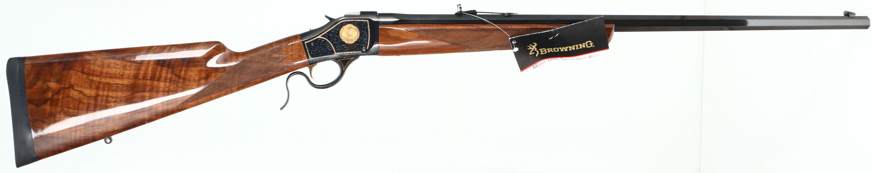 Browning, Model 1885 High Wall, Friend of the NRA Gun of the Year. CAL: 45-70, MFG: Modern, SN: 01432MY371, Lever Falling Block Single Shot Rifle, 28'' octagon barrel. The receiver has scroll ornamentation w/ gold plated borders. Right side features gold plated ''NRA'' medallion over inscription ''2002 Friends of NRA / Gun of the Year / 431 of 875''. Left side features a game scene w/ gold plated bull & cow elk. The factory checkered straight grip fancy walnut stock & Schnabel forend are excellent, with beautiful grain & a high gloss finish. Checkering is crisp. There are a few tiny finish level scuffs, from handing & storage. The original deep metal blue finish rates 99% overall on the barrel, receiver & lever. Bore is excellent. The rifle is fitted with factory open sight. Buttstock carries an original Browning solid recoil pad. Sling studs. Gold trigger. Comes with the original hanging tag still on wrist. Basically NOS, with just a few handling marks. A fantastic & high quality rifle. FFL Req. - Value: 800 to 1200